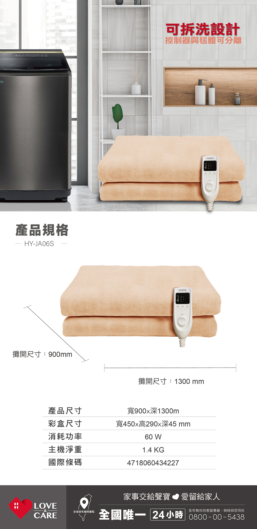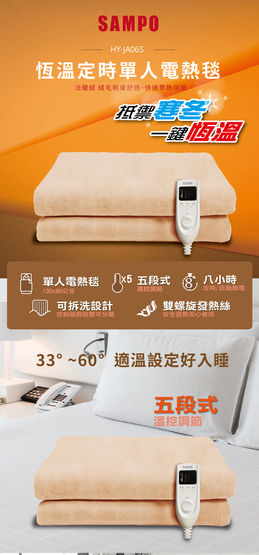 聲寶HY-JA06S 恆溫定時單人電熱毯