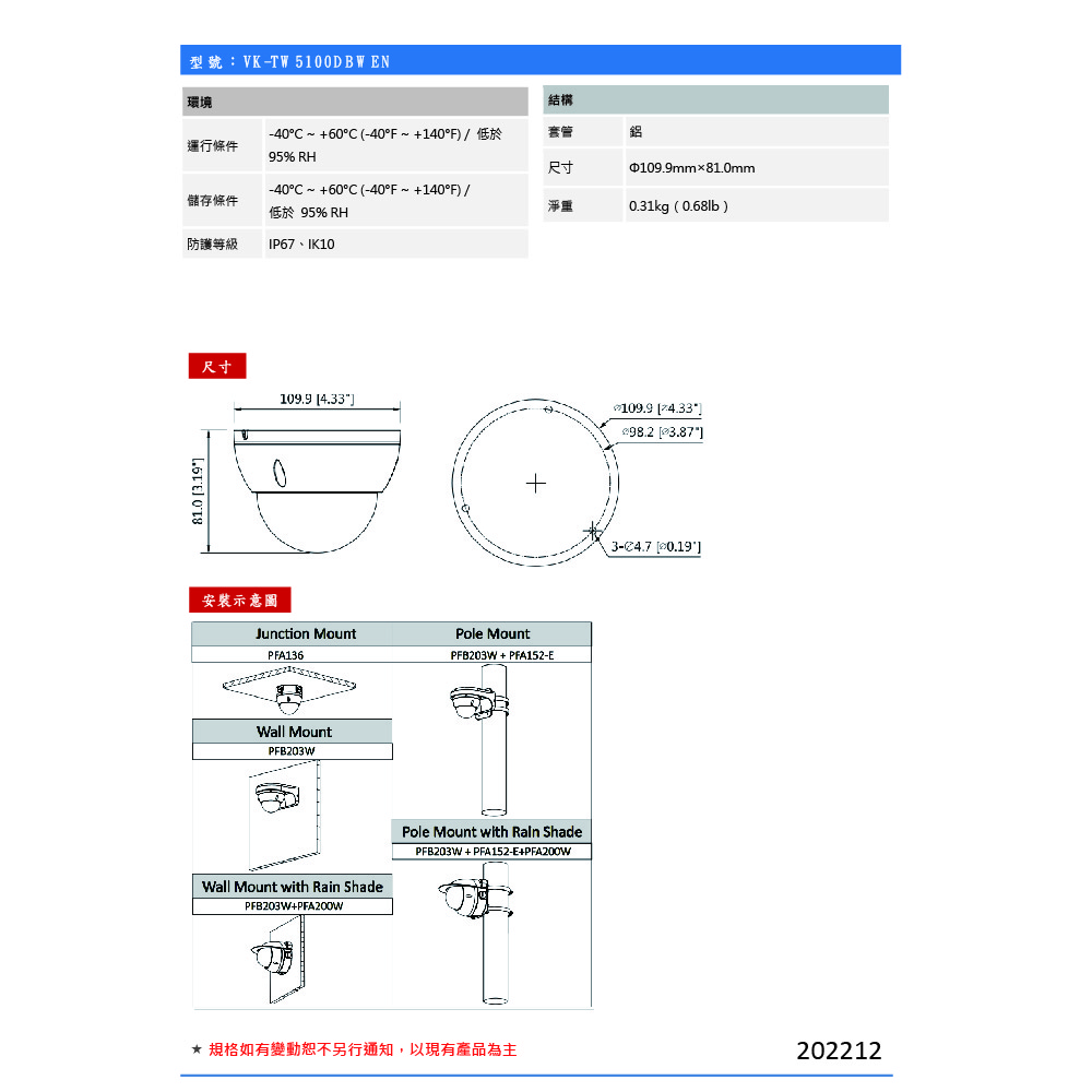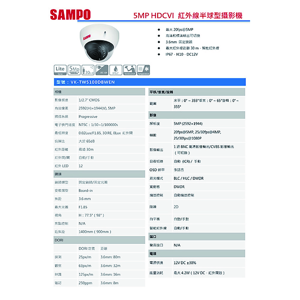 昌運監視器 SAMPO 聲寶 VK-TW5100DBWEN 5MP HDCVI 紅外線半球型攝影機 IP67 防水等級