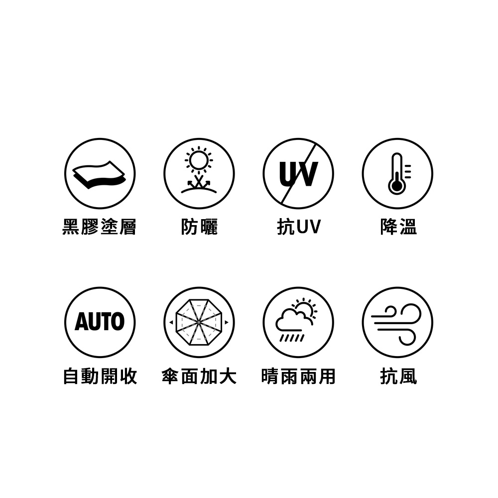 ★直徑120cm大傘面_可雙人同時使用★★黑膠防曬圖層_達到傘下降溫效果★★抗紫外線★★強化樹脂ABS傘骨_抗風力提升★★圓柱型手柄設計_舒適兼具時尚★★一鍵自動開收功能★
