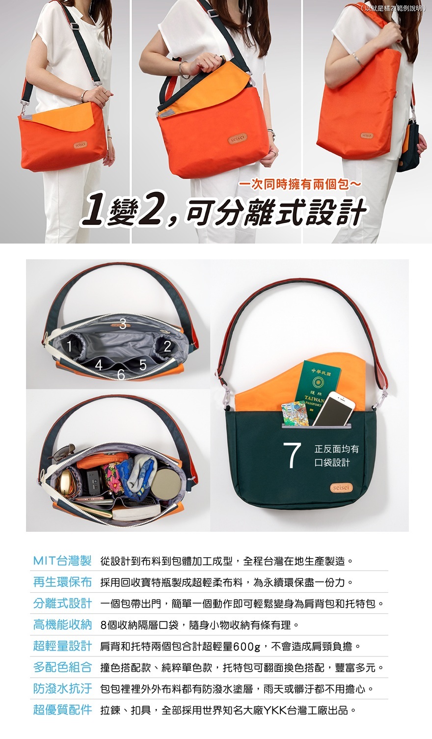 ★ 可分離式設計,輕輕鬆鬆 1變2,說變就變! ★ 台灣在地生產 MADE IN TAIWAN! ★ 永續環保 回收寶特瓶製成再生環保布料 ★ 多收納口袋,讓隨身小物都能輕鬆分類收納 ★ 防潑水抗汙設計,輕輕擦拭就可保持乾淨 ★ YKK 超級優質扣具 可上下90度與左右靈活轉動