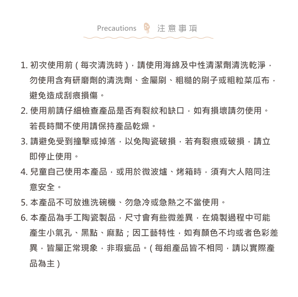6.陶瓷製品在燒製過程中可能產生氣泡、黑點;釉彩為手工燒製,如有顏色不均,皆屬產品本身特性,為正常現象,非瑕疵品。