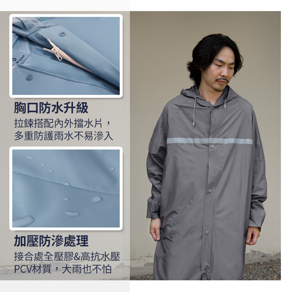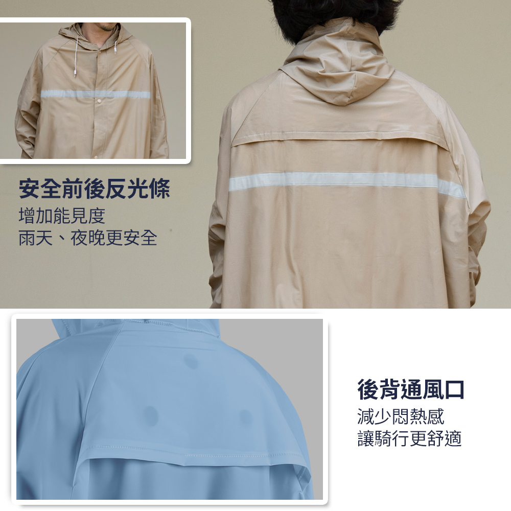 快速穿脫,通風不悶熱✔️胸口多層防護,不易滲水✔️前後反光條,高能見度更安全✔️後背通風設計,雨季不悶熱✔️貼心內束口,衣服袖口不淋濕