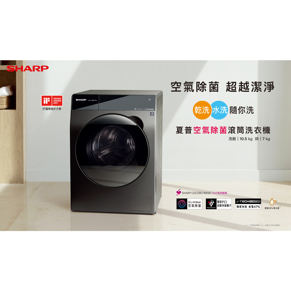商品特色:AIoT智慧機種:洗衣行程推播通知+洗衣便利通榮獲 iF設計大獎鏡面觸控大面板18˚觸控傾角設計獨家Dry AirWash空氣除菌離子技術,空氣"乾"洗無死角,徹底除臭除菌獨家水冷凝式高效率乾衣技術颱風等級18m/s超強風速,勁風烘乾獨特風鼓設計+晶鑽立體內槽全新超淨洗瀑布流技術高溫蒸氣洗淨 除菌99.9%90˚C 高溫槽洗淨 徹底除臭殺菌日本J-TECH變頻技術 省電效率47%金級省水標章/節能標章4組專業避震器設計6段水溫洗淨(冷水/20/30/40/60/90°C)15分鐘淨速洗程*抗菌墊片材質設計,有效抑制異味商品規格:型號:ES-FKA105WDT顏色:尊爵灰容量:10.5kg烘衣容量:7kg額定電壓頻率:AC 110V / 60Hz可變轉速:有面板顯示:液晶面板顯示預洗功能:〇預約時間:〇排水棉絮濾網:〇筒槽夜視燈:〇變頻:J-TECH變頻技術操作面板:觸控式操作內槽材質:晶鑽不銹鋼兒童安全鎖:〇槽洗淨功能:〇(90˚C 高溫槽洗淨)節能標章:金級本體尺寸(不含軟管):59.8 x 68 x 85 cm外箱尺寸:65 x 74 x 89.5 cm重量:毛重 78kg / 淨重 73kg產地:中國貨源:公司貨保固:一年NCC:CCAI17LP075CT9BSMI:R3B801本商品資訊由網路及官網收集彙整而成,僅供參考,如有更新或異動不另外通知,正確商品資訊及規格以實機為準。鑑賞期非試用期,產品一經拆箱、插電及使用皆會影響您退貨權利。廢四機回收資訊:如需回收廢四機請於下單時備註,如未於訂單備註,後續需另派工收回將酌收派工費用500~1200元(跨區費另計)新購公告指定規格之電視機、洗衣機、電冰箱或冷、暖氣機時,販賣業者應提供同項目、數量、時間及同送達地址之廢四機回收(搬、載運)無償服務。但不包含為搬運、拆卸而動用大型機具、工程或危險施工等。消費者本人簽名確認已被口頭告知或知悉上述權益。本站配合環保署廢四機回收服務,本公司廢四機回收專線:0800-550678,環保署資源回收專線0800-085717。