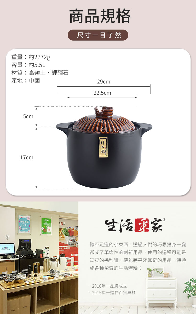 商品規格:1.尺寸:約W29*L22.5*H22cm2.材質:高嶺土、鋰輝石3.容量:約5.5公升4.重量:約2772g/個5.產地:中國6.適用:瓦斯爐、電陶爐、黑晶爐、卡式爐、休閒爐※商品為人工丈量略有誤差,請以實品為準。※網頁圖片因拍攝關係或螢幕設定不同而會與實際商品略有色差,請以實際收到商品為準。