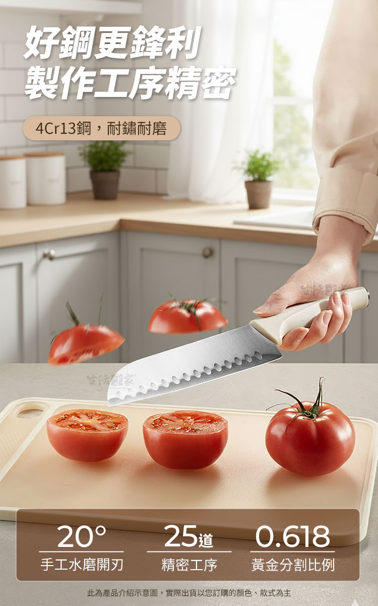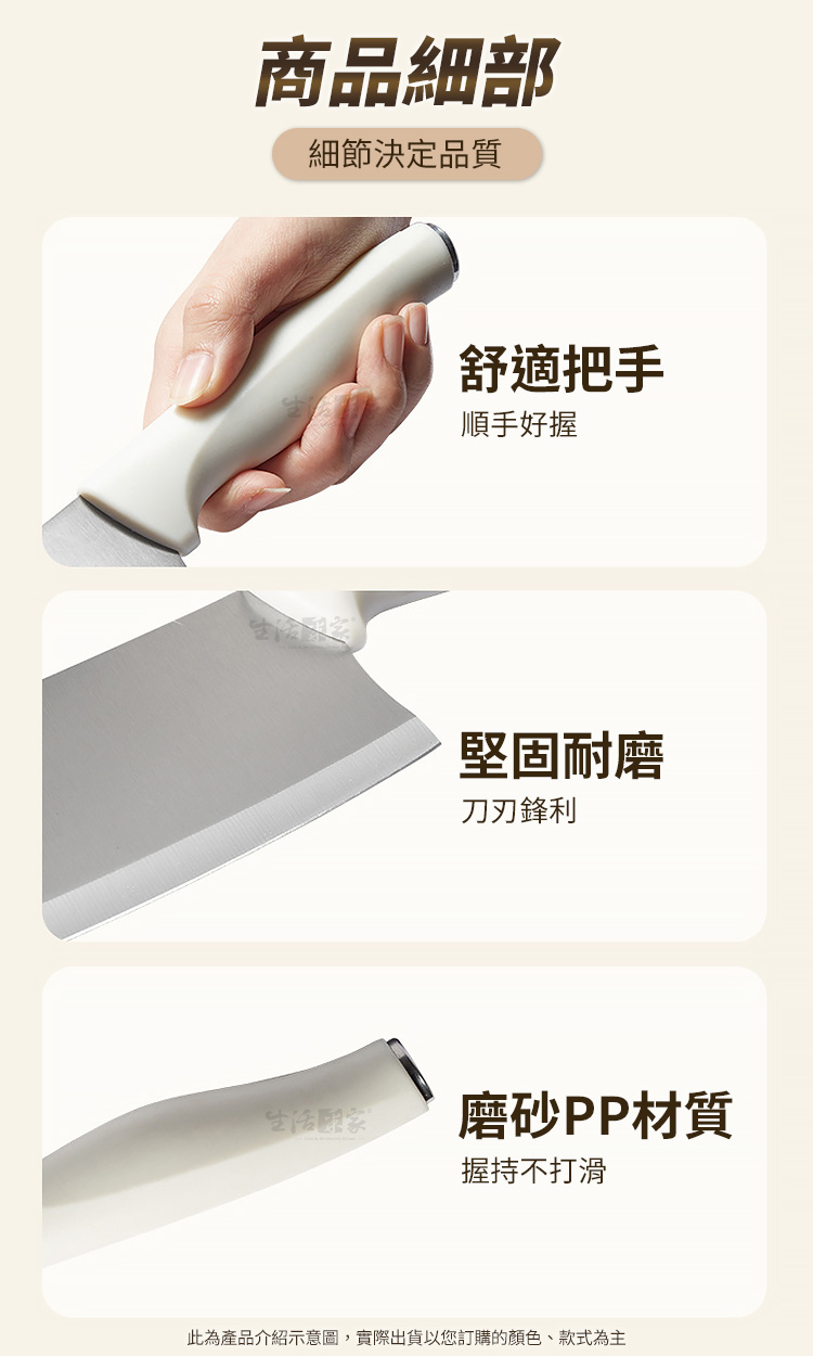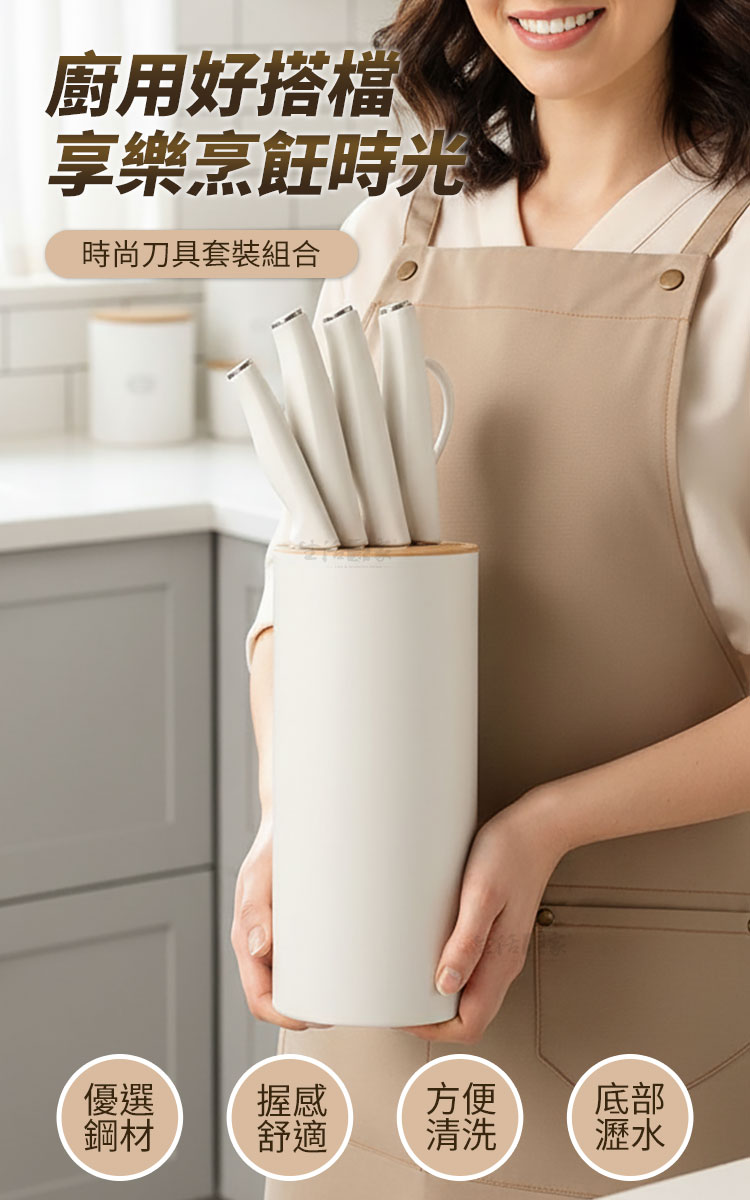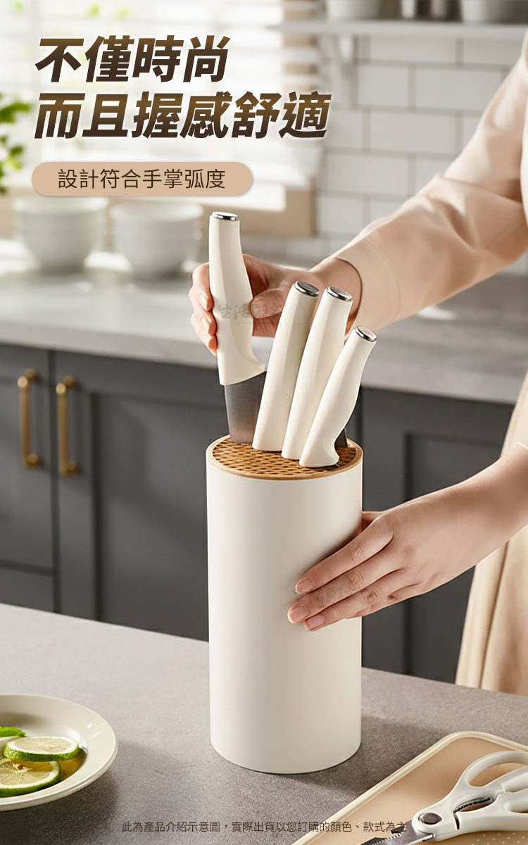 生活采家 時尚不鏽鋼刀具組|讓料理成為每日儀式感在家的廚房裡,一套順手的刀具,決定了一天料理的心情✨【生活采家 時尚刀具組】以人體工學與北歐極簡設計結合,讓每一次切、剁、削、剪,都成為一種優雅節奏。👉 全套齊全設計:內含菜刀、廚師刀、水果刀、剪刀與收納瀝水刀架,一組滿足日常料理需求。👉 嚴選4Cr13不鏽鋼材質:經25道精密製程、20°手工水磨角,耐磨防鏽又鋒利持久。👉 防滑PP磨砂握柄:貼合手掌弧度,長時間握持不打滑,輕鬆掌握每一次下刀。👉 可拆式瀝水刀架:內層可分離設計,清洗不藏污納垢,底部導水孔保持乾爽,防止細菌滋生。👉 時尚簡約外型:柔霧奶油白搭配木紋質感,完美融入現代廚房美學。🌿使用後你會發現~✅ 切番茄不噴汁,刀鋒俐落不卡肉。✅ 洗刀架不再麻煩,一沖即淨無異味。✅ 收納整齊,廚房空間更簡潔有序。✅ 鋒利度持久不生鏽,料理更輕鬆順手。✅ 無論新手或家庭主婦,都能輕鬆上手,享受烹飪樂趣!一套刀具,用十年不誇張。選擇生活采家,讓「料理」成為每天的小確幸。🎁 馬上入手,立即為你的廚房換上新氣象吧!#生活采家 #廚房刀具組 #不鏽鋼刀具 #廚房收納 #料理必備📣FAQ (常見問答_)Q1:這組刀具可以洗碗機清洗嗎?A:建議以清水沖洗並擦乾即可,延長刀鋒壽命並保持亮潔。Q2:刀架真的可以瀝水嗎?A:是的!底部設有導水孔,防積水、防潮、防霉,保持刀具乾爽衛生。Q3:刀柄會滑手嗎?A:不會,採用磨砂PP防滑材質,符合手掌弧度,握感穩定舒適。Q4:適合哪類族群?A:非常適合家庭主婦、租屋族、小家庭及料理愛好者。Q5:刀具容易生鏽嗎?A:不會,刀身採用4Cr13防鏽鋼材,耐磨抗氧化,長時間使用仍可保持光亮。注意事項:1.初次使用前請以中性清潔劑洗淨後擦乾。2.使用後請立即清洗並保持乾燥,避免長時間浸泡。3.請勿用於冷凍食品或堅硬骨頭,以免損傷刀刃。4.刀具請遠離孩童可觸及範圍。5.刀架拆洗後請完全晾乾再組裝,維持良好通風。商品規格:1.尺寸:水果刀約長20cm、料理刀約長23.5cm、菜刀約長29cm、剪刀約長20cm、刀座約直徑11.5*高22.5cm2.刃長:水果刀約9.5cm、料理刀約13.2cm、菜刀約12.3cm、剪刀約7.5cm3.材質:PP、不鏽鋼4.重量:約987g/組5.產地:中國6.商品:水果刀、料理刀、菜刀、剪刀、瀝水刀座各1※商品為人工丈量略有誤差,請以實品為準。※網頁圖片因拍攝關係或螢幕設定不同而會與實際商品略有色差,請以實際收到商品為準。