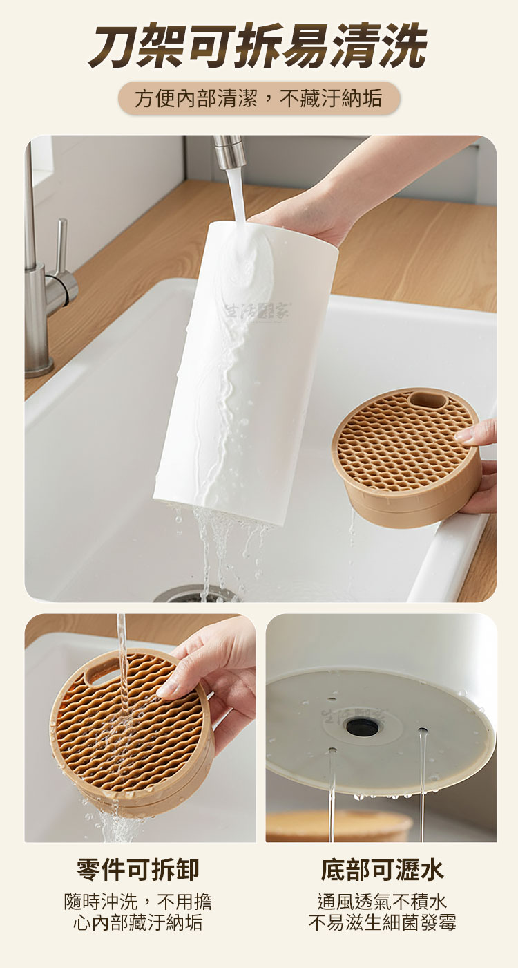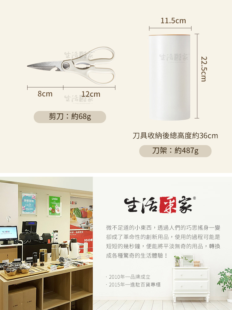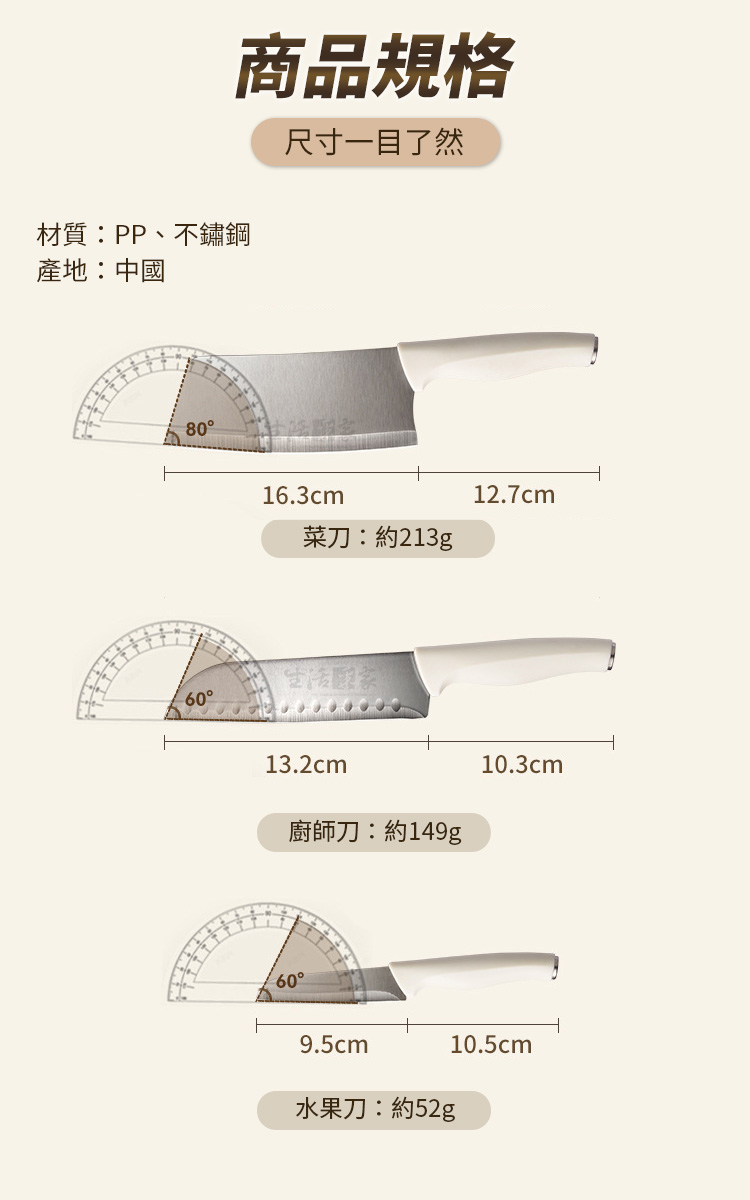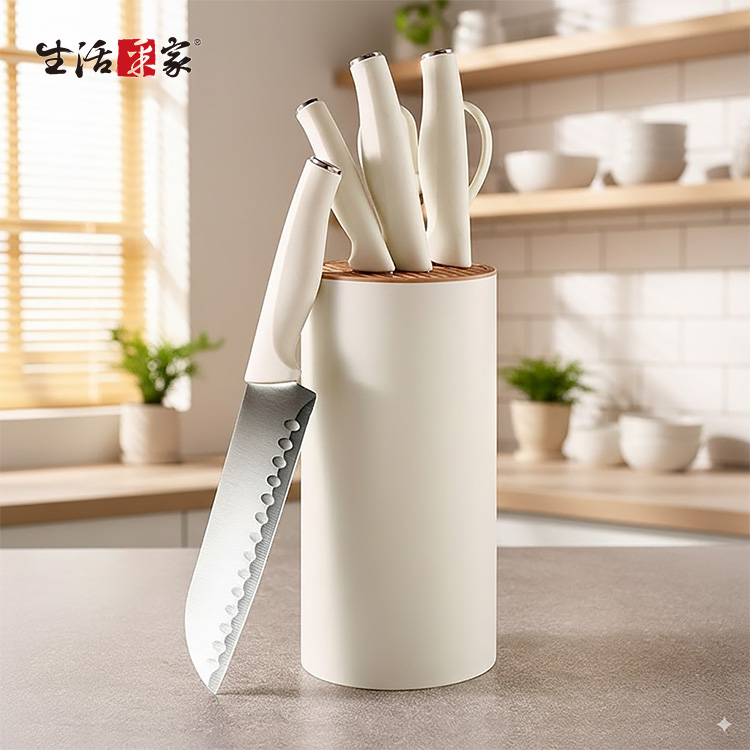 生活采家 時尚不鏽鋼刀具組|讓料理成為每日儀式感在家的廚房裡,一套順手的刀具,決定了一天料理的心情✨【生活采家 時尚刀具組】以人體工學與北歐極簡設計結合,讓每一次切、剁、削、剪,都成為一種優雅節奏。👉 全套齊全設計:內含菜刀、廚師刀、水果刀、剪刀與收納瀝水刀架,一組滿足日常料理需求。👉 嚴選4Cr13不鏽鋼材質:經25道精密製程、20°手工水磨角,耐磨防鏽又鋒利持久。👉 防滑PP磨砂握柄:貼合手掌弧度,長時間握持不打滑,輕鬆掌握每一次下刀。👉 可拆式瀝水刀架:內層可分離設計,清洗不藏污納垢,底部導水孔保持乾爽,防止細菌滋生。👉 時尚簡約外型:柔霧奶油白搭配木紋質感,完美融入現代廚房美學。🌿使用後你會發現~✅ 切番茄不噴汁,刀鋒俐落不卡肉。✅ 洗刀架不再麻煩,一沖即淨無異味。✅ 收納整齊,廚房空間更簡潔有序。✅ 鋒利度持久不生鏽,料理更輕鬆順手。✅ 無論新手或家庭主婦,都能輕鬆上手,享受烹飪樂趣!一套刀具,用十年不誇張。選擇生活采家,讓「料理」成為每天的小確幸。🎁 馬上入手,立即為你的廚房換上新氣象吧!#生活采家 #廚房刀具組 #不鏽鋼刀具 #廚房收納 #料理必備📣FAQ (常見問答_)Q1:這組刀具可以洗碗機清洗嗎?A:建議以清水沖洗並擦乾即可,延長刀鋒壽命並保持亮潔。Q2:刀架真的可以瀝水嗎?A:是的!底部設有導水孔,防積水、防潮、防霉,保持刀具乾爽衛生。Q3:刀柄會滑手嗎?A:不會,採用磨砂PP防滑材質,符合手掌弧度,握感穩定舒適。Q4:適合哪類族群?A:非常適合家庭主婦、租屋族、小家庭及料理愛好者。Q5:刀具容易生鏽嗎?A:不會,刀身採用4Cr13防鏽鋼材,耐磨抗氧化,長時間使用仍可保持光亮。注意事項:1.初次使用前請以中性清潔劑洗淨後擦乾。2.使用後請立即清洗並保持乾燥,避免長時間浸泡。3.請勿用於冷凍食品或堅硬骨頭,以免損傷刀刃。4.刀具請遠離孩童可觸及範圍。5.刀架拆洗後請完全晾乾再組裝,維持良好通風。商品規格:1.尺寸:水果刀約長20cm、料理刀約長23.5cm、菜刀約長29cm、剪刀約長20cm、刀座約直徑11.5*高22.5cm2.刃長:水果刀約9.5cm、料理刀約13.2cm、菜刀約12.3cm、剪刀約7.5cm3.材質:PP、不鏽鋼4.重量:約987g/組5.產地:中國6.商品:水果刀、料理刀、菜刀、剪刀、瀝水刀座各1※商品為人工丈量略有誤差,請以實品為準。※網頁圖片因拍攝關係或螢幕設定不同而會與實際商品略有色差,請以實際收到商品為準。