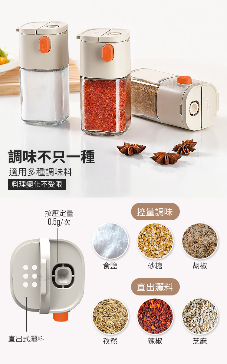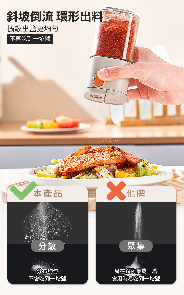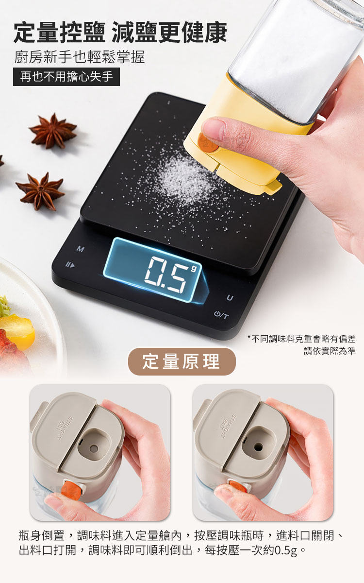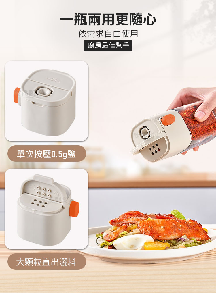 生活采家 二用型定量出鹽調味瓶 180ml|健康飲食的最佳料理幫手你是不是常常做菜時,一不小心就撒太多鹽?😅【生活采家 二用型定量出鹽調味瓶】專為健康飲食設計,單次按壓精準出0.5g,幫助你有效控鹽、減少負擔。✅ 定量出料 0.5g/次 — 精準控鹽,減少過量攝取,養成健康飲食習慣。✅ 單手操作設計 — 烹飪過程中輕鬆按壓,簡單省力,料理不慌亂。✅ 雙用設計 — 一瓶兩用,可切換「定量控鹽」與「大顆粒直出」模式,靈活應對各種食材需求。✅ 密封防潮結構 — 採雙重密封,有效阻隔水氣與油煙,避免調味料結塊。✅ 加厚玻璃瓶身 — 耐磨耐用,容量180ml,透明可視剩餘量,方便即時補充。✅ 可拆洗結構 — 全身可拆卸,零件好清潔,無死角不藏汙納垢。👉 使用後你會發現~🌿 鹽不再忽多忽少,調味均勻健康。🍲 烹飪效率提升,單手即可操作。🥗 不只是鹽,糖、胡椒、孜然、辣椒粉、芝麻…多種調味料都能輕鬆使用。💧 廚房環境潮濕也不怕,調味料保持乾燥不結塊。✨ 無論是日常家常菜,還是健康控鹽飲食,都能帶來滿滿便利感。還在用傳統撒鹽罐嗎?容易倒太多、結塊、不均勻,讓料理大打折扣。選擇【生活采家 二用型定量出鹽調味瓶】,讓每一道菜都精準調味,健康又美味!立即入手,成為您廚房的最佳助手!👉 快把它加入購物車,提升料理質感,讓健康控鹽成為生活習慣!#健康控鹽 #廚房必備 #定量調味瓶 #防潮設計 #生活采家📣 FAQ (常見問答)Q1:每次出料的份量是多少?A1:每次按壓約 0.5g,適合控鹽、控糖、控胡椒等精準調味需求。Q2:可以放哪些調味料?A2:適用於食鹽、白砂糖、黑胡椒粉、孜然粉、辣椒粉、芝麻等各類粉末或顆粒調味料。Q3:會不會因潮濕而結塊?A3:瓶身採雙重密封設計,有效防潮、防油煙,保持調味料乾燥。Q4:清潔方便嗎?A4:可全身拆卸,玻璃瓶身與上蓋零件皆可單獨清洗,乾淨無死角。Q5:容量是多少?能放多久?A5:容量約180ml,一般家庭日常使用可存放約1-2週調味份量,依實際使用情況而定。注意事項:1.請避免裝入含水分或過於黏性的調味料,以免堵塞。2.不同調味料重量略有差異,0.5g為參考值。3.使用後請保持瓶身乾燥,延長使用壽命。4.勿靠近火源或高溫環境,以免影響塑件與玻璃結構。5.清潔時建議以清水沖洗,避免使用強酸或強鹼清潔劑。
