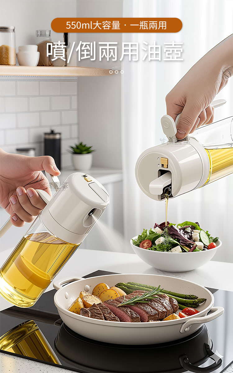 倒噴兩用玻璃油壺550ml|健康飲食從控油開始!🍳 想要料理美味卻又不想油膩負擔?【生活采家 倒噴兩用醬料玻璃油壺550ml】讓你輕鬆控油,一瓶搞定煎、炒、烘、烤、拌,從此開啟健康飲食新習慣!💡✅ 噴倒兩用設計:可一鍵切換噴霧或倒油,炒菜、沙拉、烘烤、氣炸鍋都能精準使用。✅ 550ml大容量:等同三瓶一般油噴壺容量,滿足日常家庭需求。✅ 均勻細霧噴灑:3D廣角霧化,減少油量使用,料理更健康。✅ 透明玻璃:無毛細孔安全衛生,透明瓶身方便查看剩餘油量。✅ 防漏防滴設計:傾倒即開蓋,回正即回流,不浪費每一滴油。👉 使用後你會發現~🥗 做沙拉:輕輕一噴,清爽均勻,避免過油膩口。🍳 煎炒烹飪:精準倒油,火候掌握更到位。🔥 氣炸鍋料理:均勻噴霧,少油也能酥脆可口。🍖 燒烤牛排:噴霧上油,香氣均勻,鎖住肉汁。➡️ 為什麼你需要它?現代人講究健康飲食,卻常難以控制油量。這款油壺,讓你「吃得美味,少油無負擔」。它不僅是料理的美型單品,更是全家健康的守護者。👉 一瓶搞定 煎、炒、烘、烤、拌,從此遠離過量油脂!✨ 別再猶豫!現在就入手,給自己和家人一份輕盈健康!#健康控油 #廚房神器 #噴倒兩用 #玻璃油壺 #少油飲食📣 FAQ (常見問答)Q1:這款油壺可以裝哪些油?A1:可裝橄欖油、葵花籽油、花生油、醬油、醋等液體調味品。Q2:用完油會滴油嗎?A2:不會,瓶蓋自動開合不滴油不掛油,不用擔心會弄髒桌面。Q3:噴霧會不均勻嗎?A3:本產品為3D廣角噴霧設計,霧化均勻,不會有大滴水珠。Q4:容易清洗嗎?A4:瓶口加大設計,可直接伸手或用刷子清潔,簡單方便。Q5:容量會太大嗎?A5:550ml適合家庭日常使用,不必頻繁加油,一瓶即可滿足多場景料理需求。注意事項:1.請勿盛裝高黏度液體(如蜂蜜、糖漿),避免堵塞噴頭。2.使用噴霧模式時,務必將鎖扣調整至正確位置,避免漏油。3.建議定期清洗瓶身與噴頭,保持出油暢通。4.遠離火源與高溫環境,以免瓶身損壞。5.初次使用請先用清水測試噴頭功能,確保噴霧均勻。