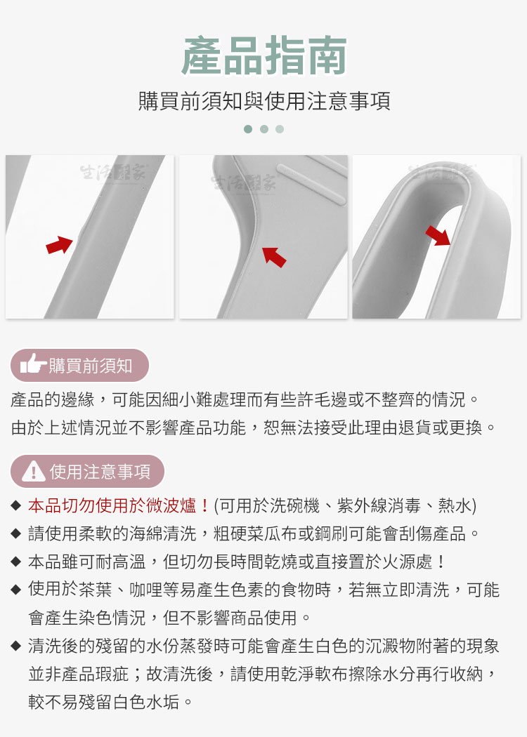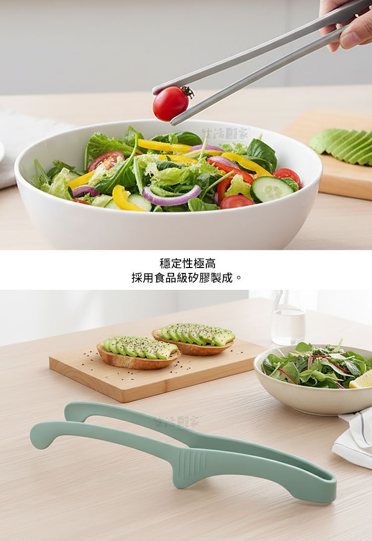 生活采家莫蘭迪矽膠食物夾|不鏽鋼骨架,耐熱250℃,輕巧穩固的廚房料理神器告別傳統廚具痛點,享受料理新美學!您是否厭倦了傳統金屬食物夾的笨重、易刮傷鍋具,或是塑料夾子不耐高溫、用久變形的問題?【生活采家】為您帶來革命性的莫蘭迪色系一體成形矽膠食物夾!這款食物夾不僅擁有療癒的莫蘭迪美學色彩(粉、灰、綠),更將實用性與安全性推向極致。無論是在廚房、高溫燒烤,或是精緻的餐桌佈置,它都是您最可靠的幫手。我們深知您對食品安全的堅持,因此採用食品級矽膠,讓您從此告別夾取食材時的後顧之憂!四大升級,專為高效與衛生設計-👉 內建金屬骨架,堅固耐用不變形:市面上多數矽膠夾易軟塌,我們這支內建不鏽鋼骨架,提供強勁支撐力,即使在高溫下,也能長久使用不變形,握感紮實、夾取穩定。👉 獨創支點設計,衛生不沾桌:精心設計的底部支點,讓食物夾在放置桌面時,夾取端能懸空不接觸桌面,有效保持食物的衛生與整潔,避免料理中的交叉污染,非常適合分食或公用取餐場合。👉 食品級矽膠,安全耐熱易清潔:採用高等級食品級矽膠一體成形,防滑且對鍋具友善,不會產生刮痕。材質防燙耐高溫,且髒污不易附著,可使用洗碗機及紫外線消毒,清潔保養輕鬆簡單。👉 工學握把與止滑凸紋:握持處設有防滑凸紋,符合手部曲線,操作舒適穩固。尖端圓嘴設計,便於夾取沙拉、小番茄等小型精緻食材,圓頭內凹設計則方便夾取大塊肉品或麵包。🧑🍳 使用後你會發現~料理效率與生活品質全面提升,您將體驗到前所未有的夾取穩定性,無論是煎烤中的牛排、熱騰騰的義大利麵,還是冰鎮的沙拉,都能輕鬆掌握。不再擔心夾子倒下弄髒桌面,也不用擔心高溫損壞器具。莫蘭迪的色彩更為您的餐桌增添一抹低調優雅的氣質。從廚房烹飪到餐桌分食,一夾多用,真正實現高效、安全、美觀的廚房生活!🔜立即選購,讓料理更優雅!矽膠食物夾重量輕,好握取,每一次使用都是一份驚喜!現在就入手這款廚房美學好物,提升您的居家料理效率!#生活采家 #矽膠食物夾 #耐熱餐具 #不傷鍋設計 #莫蘭迪廚具📣 FAQ (常見問答)Q1: 請問這款食物夾可以進微波爐或烤箱使用嗎?A1: 不可以。由於本產品內含金屬骨架(不鏽鋼),絕對禁止放入微波爐使用!但它耐熱 250∘C,可用於洗碗機、熱水消毒,請放心用於一般高溫烹飪夾取。Q2: 矽膠材質會很容易染色或殘留異味嗎?A2: 矽膠本身不易吸附異味,但若夾取如茶葉、咖哩等易產生色素的食物後沒有立即清洗,可能會產生染色情況,但不影響商品功能。建議使用後即時用中性清潔劑清洗。Q3: 請問食物夾的尺寸與重量是多少?A3: 產品尺寸約 26cm 長,寬約 8cm,重約 109g。輕巧設計,單手操作無負擔。Q4: 為什麼我的食物夾在清洗後會出現白色沉澱物?A4: 清洗後的殘留水份蒸發時,可能會產生白色沉澱物,這通常是水中的礦物質殘留(水垢),並非產品瑕疵。建議清洗後用乾淨軟布擦拭去除水份再收納,較不易殘留水垢。Q5: 購買時可以指定顏色嗎?A5: 本商品顏色(粉、灰、綠)採隨機出貨,無法指定特定顏色,敬請見諒。注意事項:1.禁止使用於微波爐! 產品內含金屬骨架,嚴禁放入微波爐加熱或使用。2.避免長時間空燒! 本產品雖耐高溫,但切勿將其長時間放置在熱源上直接空燒。3.清潔時請使用柔軟海綿! 請使用柔軟的海綿清洗;粗硬菜瓜布或鋼刷可能會刮傷產品表面。4.注意染色問題! 夾取深色、高色素食物(如咖哩、咖啡等)後,請務必立即清洗,避免色素殘留。5.邊緣毛邊不影響功能! 產品邊緣可能因細小處理而有些許毛邊或不整齊,此為正常現象,不影響產品功能,無法因此理由退貨或更換。