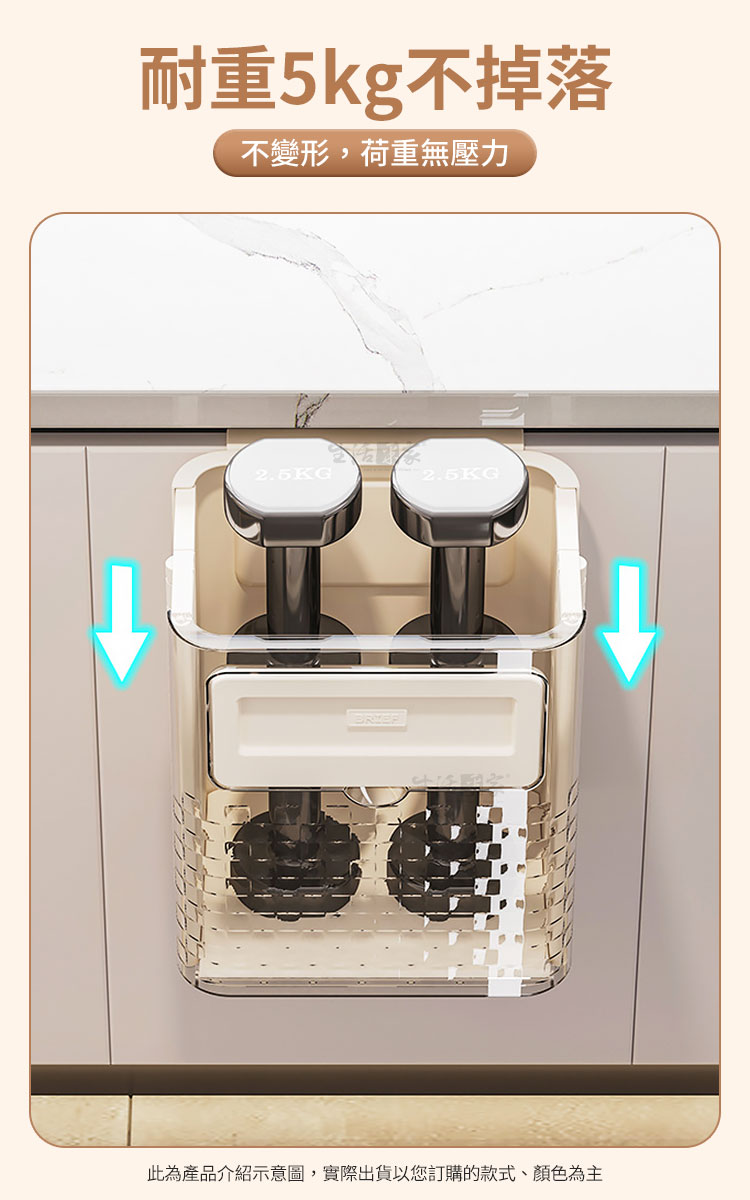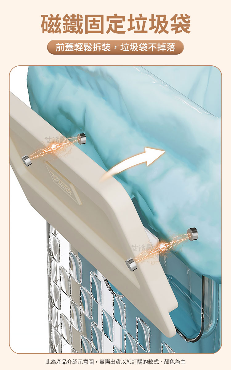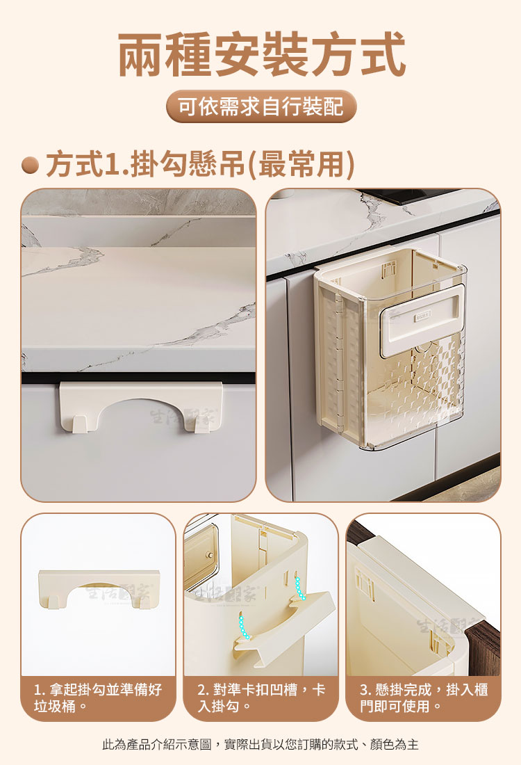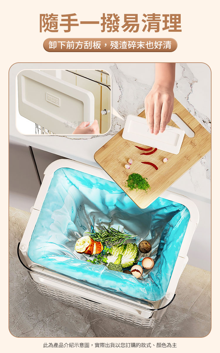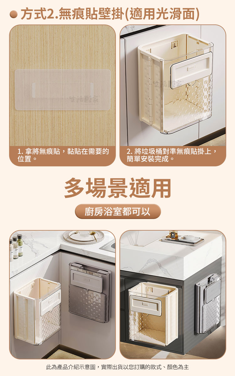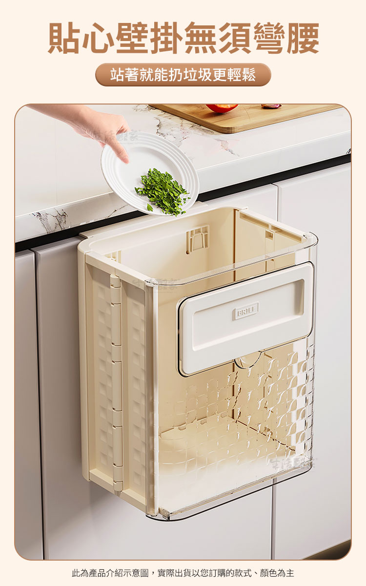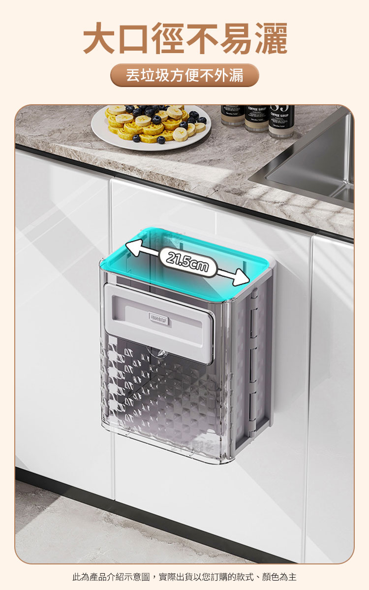 折疊垃圾桶|省空間壁掛安裝| 大口徑易清洗|耐重不掉落|壁掛垃圾桶 省空間垃圾桶你是否常常覺得廚房垃圾桶又佔空間又難清理?這款【折疊垃圾桶】專為小空間家庭設計,壁掛免彎腰、折疊省空間,不論是廚房切菜、浴室日常清潔,甚至小坪數套房,都能輕鬆安裝使用。✅ 折疊設計,靈活省空間:未使用時可折疊至僅 6.9cm 厚,使用時展開可達 17.5cm,大容量不侷限。✅ 大口徑設計,投放更方便:21.5cm 大口徑,食材殘渣直接倒入,不易外漏,保持檯面乾淨整潔。✅ 雙重安裝方式:支援掛勾懸掛與無痕貼壁掛,適用於櫥櫃、光滑牆面,安裝簡單,隨裝隨用。✅ 耐重承載力強:可承重高達 5kg,裝滿廚餘或日常垃圾也不易變形掉落。✅ 磁鐵固定垃圾袋:前蓋自帶磁吸設計,牢牢固定垃圾袋,倒垃圾不再滑落。✅ 可清洗透明面板:簡單拆卸即可清洗,保持乾淨衛生。🌈 使用後你會發現~✔ 免彎腰倒垃圾,烹飪更輕鬆✔ 折疊收納,不佔廚房寶貴空間✔ 多場景使用,廚房、浴室都合適✔ 耐用耐重,長期使用不變形不論你是小家庭、租屋族還是愛整潔的料理人,這款折疊垃圾桶都能成為你的居家好幫手。現在就入手,讓生活空間更整潔,料理更省心!✨👉 馬上下單,享受輕鬆無壓的居家收納!#折疊垃圾桶 #廚房收納 #免彎腰設計 #小空間必備 #生活采家📣FAQ (常見問答)Q1:折疊垃圾桶能承重多少?A1:本產品可承重 5kg,不易掉落或變形。Q2:安裝需要鑽孔嗎?A2:不需要,提供掛勾懸掛與無痕貼兩種方式,免釘免鑽即可使用。Q3:適合哪些場景使用?A3:廚房、浴室、陽台、臥室皆適合,特別推薦小空間使用。Q4:垃圾袋會不會容易滑落?A4:內建磁鐵固定設計,可牢牢固定垃圾袋,不易掉落。Q5:清潔方便嗎?A5:面板可拆卸清洗,使用後只需簡單沖洗即可保持乾淨。注意事項:1.建議使用光滑平整的牆面進行無痕貼安裝,以確保牢固性。2.建議垃圾重量不超過 5kg,以延長產品使用壽命。3.定期清洗垃圾桶與面板,保持衛生與透明度。4.請避免長期接觸高溫環境,以免影響材質壽命。商品規格:1.展開尺寸:約長17.5*寬23.5*高28cm2.折疊尺寸:約長6.5*寬23.5*高28cm3.材質:PET、PP、PS塑料4.顏色:經典灰5.重量:約788g/入6.產地:中國7.安裝:掛勾懸吊、無痕壁貼8.商品:折疊式垃圾桶*1、壁貼*1※商品為人工丈量略有誤差,請以實品為準。※網頁圖片因拍攝關係或螢幕設定不同而會與實際商品略有色差,請以實際收到商品為準。