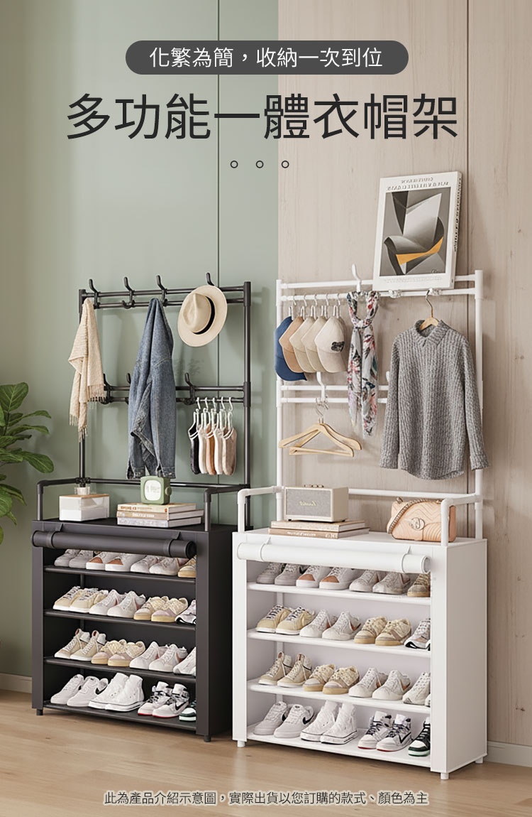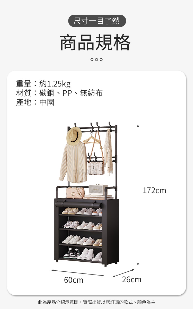好友們!最近發現了一款鞋類收納好物「落地型一體組合衣帽鞋架」!這款衣帽鞋架真的太實用了,不僅進門放鞋子超方便,就連外套、帽子也都沒問題,門口整齊到連財神爺都捨不得離開!🏠✨首先「組合式結構」,無論是安裝還是拆卸都非常方便,讓您隨時隨地都能輕鬆搬運。對於有搬家需求或愛變換家居佈局的人來說,這款架子真是太實用了!🔧🛠️「分層分類收納」回到家順手將衣服外套、帽子、鞋子等各種物品整齊收在同一個地方,不再亂成一團。「多功能一體」,在同一個架子上就能搞定所有收納需求。「雙層掛勾」設計,讓您可以掛更多物品,使用更靈活!👕👒👟最貼心的是,它還配有「防塵布套」,有效保護鞋子不受灰塵侵擾,保持整潔如新。「加粗鋼管」設計,承重力佳,掛放再多的衣服或鞋子都完全沒問題。💪🧥「潮流設計美學風格」它不僅實用,還是家中的一大亮點。「高效利用空間」,無論是放在臥室、玄關還是衣帽間,都能讓家裡變得更加整潔有序。「化繁為簡,收納一次到位」,讓我的生活變得更加方便、舒適!🌟🏡衣帽鞋架真的是我的福星,進門後心情一整個舒服,門口就是整齊、乾淨、清爽,趕來入手吧!🏠💖#衣帽鞋架 #家居收納 #組合式結構 #分層收納 #防塵布套 #潮流設計 #利用空間 #居家美學注意事項:1.請勿重摔或高處掉落,以免商品受損。2.請勿接近高溫或勿近火源處,以免商品受損。3.商品情境圖片僅供參考,實際出貨不含週邊道具及配件。4.購買前請先量測使用區域尺寸,確定無誤再購買以免尺寸不合,敬請謹慎選購。5.本商品需自行組裝,收到商品後請確實組裝,無誤後再將東西放入使用!商品規格:1.尺寸:約寬60*深26*高172cm2.材質:碳鋼、PP塑料、無紡布3.重量:約1.25kg/組4.產地:中國5.顏色:黑色6.商品:落地型一體組合衣帽鞋架60cm*1、黑色布套*1※商品為人工丈量略有誤差,請以實品為準。※網頁圖片因拍攝關係或螢幕設定不同而會與實際商品略有色差,請以實際收到商品為準。