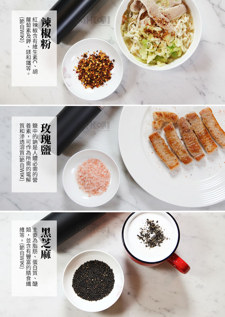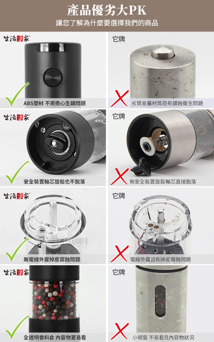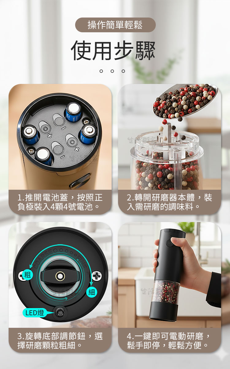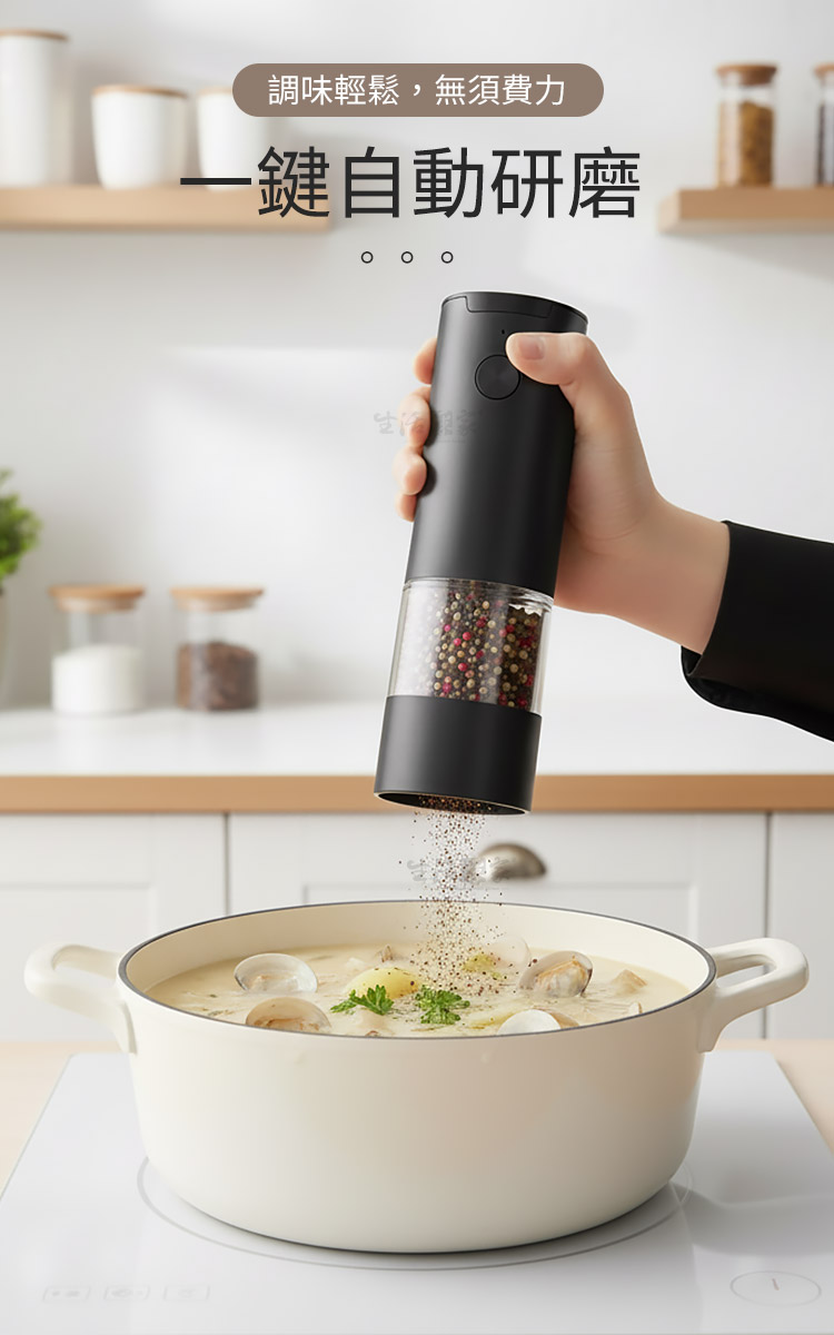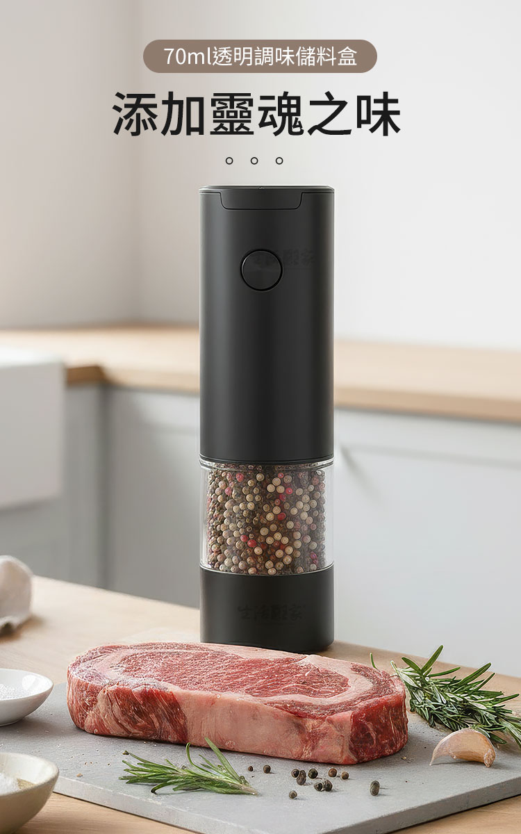 生活采家電動研磨調味罐|廚房美學與極致風味的完美邂逅餐桌上的儀式感,從香氣開始:🧂 您是否曾覺得,現成的胡椒粉總是少了一份靈魂?真正的美味,源於香料破殼而出的那一瞬。生活采家電動研磨調味罐,將科技注入烹飪之中,讓您告別用匙勺挖調味料的時代,優雅地為料理點睛。✅ 一鍵自動研磨:單手即可操作,無論是正在煎牛排還是握著湯勺,輕輕一按,新鮮香料即刻落下。✅ 精密陶瓷機芯:硬度高、耐磨損,且不會像金屬機芯那樣產生異味或鏽蝕,確保風味純淨。✅ 無段粗細調節:從細緻到顆粒感十足,順時針調細、逆時針調粗,完美匹配不同料理需求。✅ LED 輔助燈光:出口自帶柔光,即使在浪漫的弱光晚餐下,也能精準掌控調味份量。✅ 透明香料視窗:全景透明料倉 70ml,不僅視覺美觀,更能一眼看清剩餘量,補充不匆忙。👉使用後,你會發現生活變得更簡單~🍳 原本繁瑣的調味過程,現在變成了一種視覺與嗅覺的享受。當您單手操作研磨器,看著均勻的顆粒在 LED 燈映照下精準灑在滋滋作響的牛排上,那份大廚般的自信油然而生。無需插電, 4 顆 4 號電池即可提供強勁動力,無論是廚房料理還是野餐烤肉,它都是最稱職的夥伴。🔜現在就升級您的廚房質感🛍️ 別再讓劣質的調味瓶破壞您的用餐美感。生活采家電動研磨調味罐,兼具極簡設計與實用效能,是自用、喬遷送禮的首選。立即入手,開啟您的鮮香食代!#電動研磨罐 #廚房調味好物 #生活采家 #現磨胡椒 #餐桌美學📣 FAQ (常見問答)Q1:這款研磨器可以磨哪些調味料?A1:非常適合研磨黑胡椒、白胡椒、海鹽、玫瑰鹽、乾辣椒及其他小顆粒狀的乾燥香料。Q2:如何調整研磨的顆粒粗細?A2:請旋轉研磨器底部的旋鈕,順時針方向為細,逆時針方向為粗,調整非常直覺簡單。Q3:需要充電嗎?還是使用電池?A3:本產品採用 4 顆 4 號(AAA)電池供電,無需等待充電,隨換隨用非常方便。Q4:陶瓷機芯有什麼優點?A4:陶瓷材質不會生鏽,且研磨過程中不會產生熱能,能最大程度保留香料的原始香氣。Q5:清潔方便嗎?A5:料倉採用透明設計,可旋開後用乾布擦拭,機身 ABS 材質,表面平滑耐用,清潔非常輕鬆。注意事項:1.本產品不防水,請勿將整機放入水中清洗,以免電路損壞。2.請勿研磨過大、過硬的種子(如咖啡豆),以免造成陶瓷磨芯受損。3.安裝電池時請務必確認正負極方向正確,以確保動力穩定。4.請確保研磨的香料是完全乾燥的,潮濕的香料可能會堵塞磨芯。5.若長時間不使用,建議將電池取出,以避免電池漏液損壞機身。