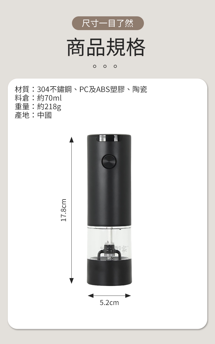 商品規格:1.尺寸:約直徑5.2*高17.8cm2.材質:304不鏽鋼、PC及ABS塑膠、陶瓷3.料倉:約70ml4.重量:約218g/支(不含電池)5.產地:中國6.電源:4顆AAA號電池(未附)7.商品:電動研磨調味罐*1※商品為人工丈量略有誤差,請以實品為準。※網頁圖片因拍攝關係或螢幕設定不同而會與實際商品略有色差,請以實際收到商品為準。