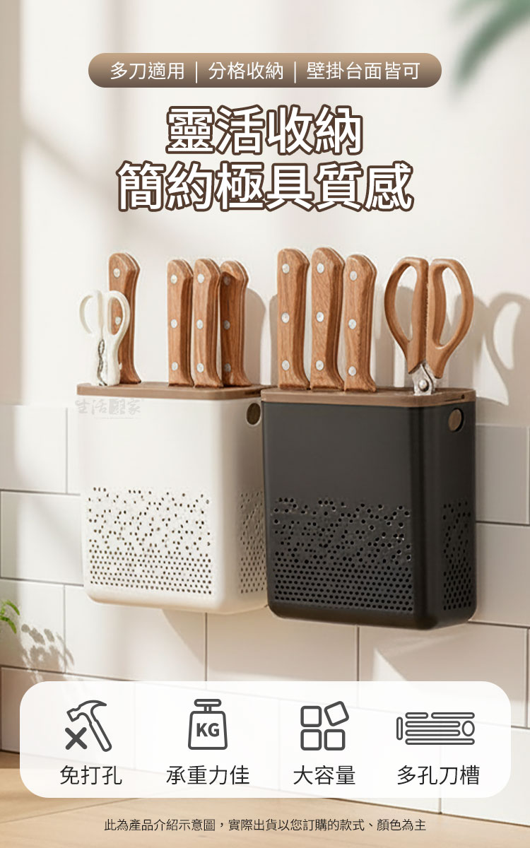 告別濕黏廚房︱生活采家︱免打孔壁掛式刀具瀝水收納架 ✨ 乾淨・高效・美學你的廚房需要「懸浮式收納」革命:免打孔、強承重、全方位防霉!廚房好物大推~你是否厭倦了廚房檯面上,濕漉漉又佔空間的傳統刀座?或是容易生鏽的刀架?潮濕的環境不僅容易滋生細菌,更會讓心愛的刀具髒污、發霉,影響家人健康?別再讓「髒污」和「擁擠」成為你下廚的阻力! 生活采家為您帶來革命性的「免打孔壁掛刀具架」,這不僅是一個收納工具,更是您打造乾淨、高效、輕奢廚房的關鍵升級!🔨 免打孔安裝,租屋族最愛! ( 無痕收納)告別牆面鑽孔破壞!採用超強黏貼技術,5KG 強悍承重力,安裝極簡、穩固不掉落。完美適用於磁磚、玻璃等光滑牆面。🌬️ 360°全方位通風透氣設計 ( 抗菌防霉)主體外殼及刀槽內膽均設計密集瀝水孔洞,確保刀具、剪刀能迅速風乾,杜絕水漬殘留,確保刀具衛生,延長使用壽命。🧼 整體可拆清,衛生無死角! ( 易潔設計)可拆卸瀝水內桶與頂部刀槽蓋設計,輕按即可開啟、取出。每一個組件都能單獨沖洗,真正做到不藏污納垢,告別傳統刀座難以清潔的衛生死角。📏 多孔刀槽分格,收納更專業! ( 多功能分類)多尺寸刀槽設計,從中式菜刀、主廚刀、剔骨刀、水果刀、磨刀棒到廚房剪刀,全部都能分門別類、安全插放。滿足您日常所有刀具的收納需求,專業俐落。🔄 靈活兩用,自由選擇擺放! (空間優化)無論是壁掛收納釋放寶貴台面空間,還是面收納隨時取用,都能完美適應。時尚的黑白雙色,輕鬆融入輕奢、極簡、北歐等各種廚房風格。💡 使用後你會發現...當您裝上這款刀具架,您會立即感受到廚房檯面彷彿被魔法淨化!髒污消失了,雜亂不見了,每一次取用刀具都變得乾淨俐落、安心無憂。它不只是收納,它是對您和家人飲食衛生的一份承諾升級。讓下廚成為一種享受,而不是一場清理的戰鬥!🔔 限時搶購,輕鬆擁有整潔廚房!✨ 選擇經典 「輕奢黑」 或優雅 「奶油白」,讓您的廚房立即升級! 🎁 現在就行動,別讓等待增加廚房的潮濕與凌亂。現在下單,即刻享受乾淨、清爽的烹飪環境!#生活采家 #免打孔刀具架 #廚房收納好物 #瀝水刀座 #壁掛式收納📣 FAQ 常見問答Q1:免打孔真的能牢固嗎?A1:可!採用強力背膠固定設計,經測試可承重4~5公斤,不易掉落。Q2:適用在哪些牆面?A2:建議使用於光滑牆面如磁磚、不鏽鋼、玻璃等。粗糙牆面或粉刷牆不建議使用。Q3:刀具架可放幾支刀?A3:共有多孔槽位,可放置約6~8支刀具+剪刀。Q4:清洗是否方便?A4:上蓋與內桶可完全拆卸,流水沖洗即可清潔乾淨,不藏污垢。Q5:可以改掛其他廚具嗎?A5:沒辦法哦,刀槽設計只能放刀具,無法放置其它廚具物品。注意事項:1.免打孔安裝僅適用於光滑、平整、無油污、無粉塵的表面,例如:光滑磁磚、大理石、玻璃、金屬板等。不適用於水泥牆、壁紙、石灰牆等粗糙或易脫落表面。2.為確保最佳承重效果,強力背膠黏貼上牆後,請務必靜置12小時後再放置刀具和重物。3.建議定期拆卸內部的瀝水桶和頂部刀槽進行沖洗,保持內部乾燥和清潔,以達到最佳的防霉抗菌效果。4.放置刀具時,請務必將刀刃朝內、刀柄朝上,確保使用安全,避免兒童誤觸或取用時造成劃傷。5. 購買前請確認您的常用刀具尺寸(尤其是刀刃厚度)是否符合產品圖所示的刀槽尺寸,並留意產品建議的承重上限。