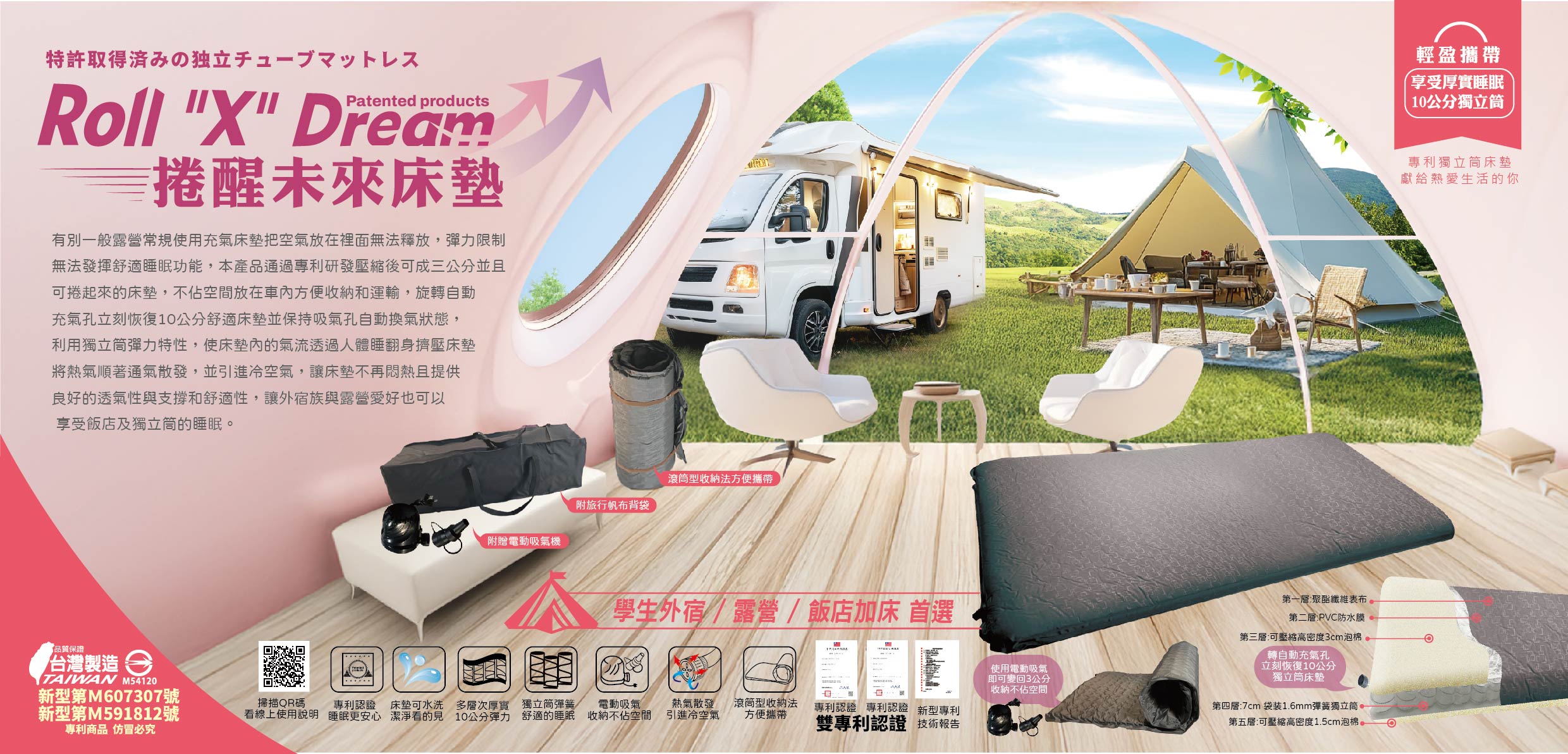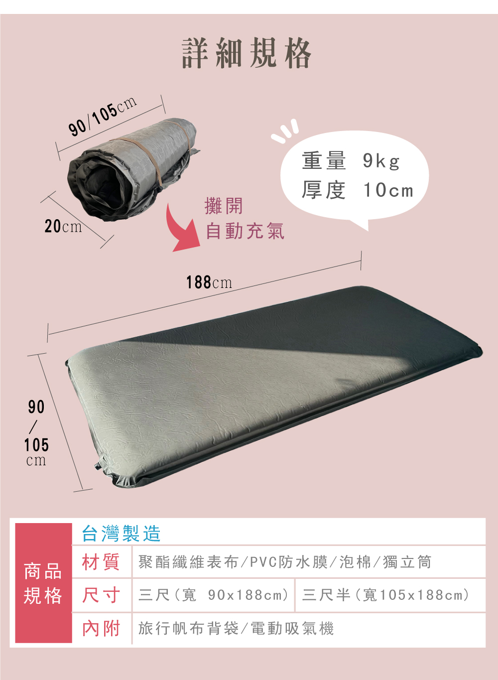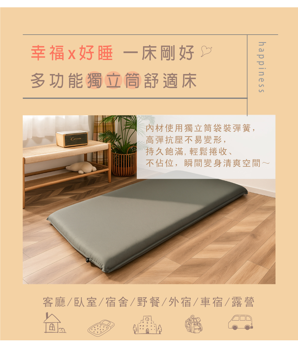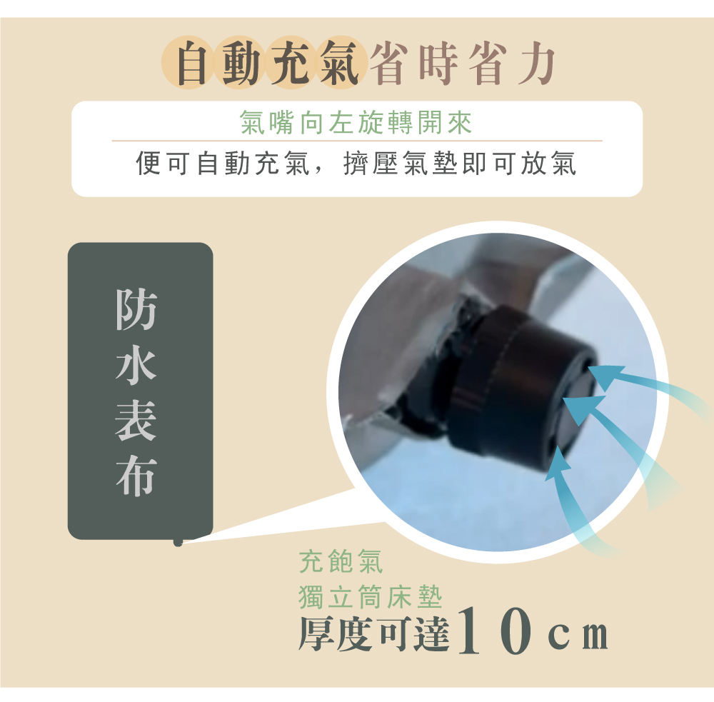 這款床墊突破傳統設計,解決充氣後無法釋放空氣與彈力不足的問題。• 空間節省壓縮至僅三公分,輕鬆捲起,便於車內收納與運輸。• 恢復舒適高度旋轉自動充氣孔迅速恢復至10公分,保持自動換氣功能。• 先進彈力與透氣設計獨立筒彈簧結構,氣流隨人體翻身排熱換氣,保持涼爽透氣。• 理想選擇無論露營或外宿,提供飯店級的舒適與支撐,讓每一夜都能安穩入睡。