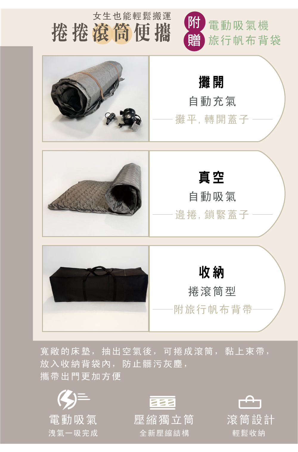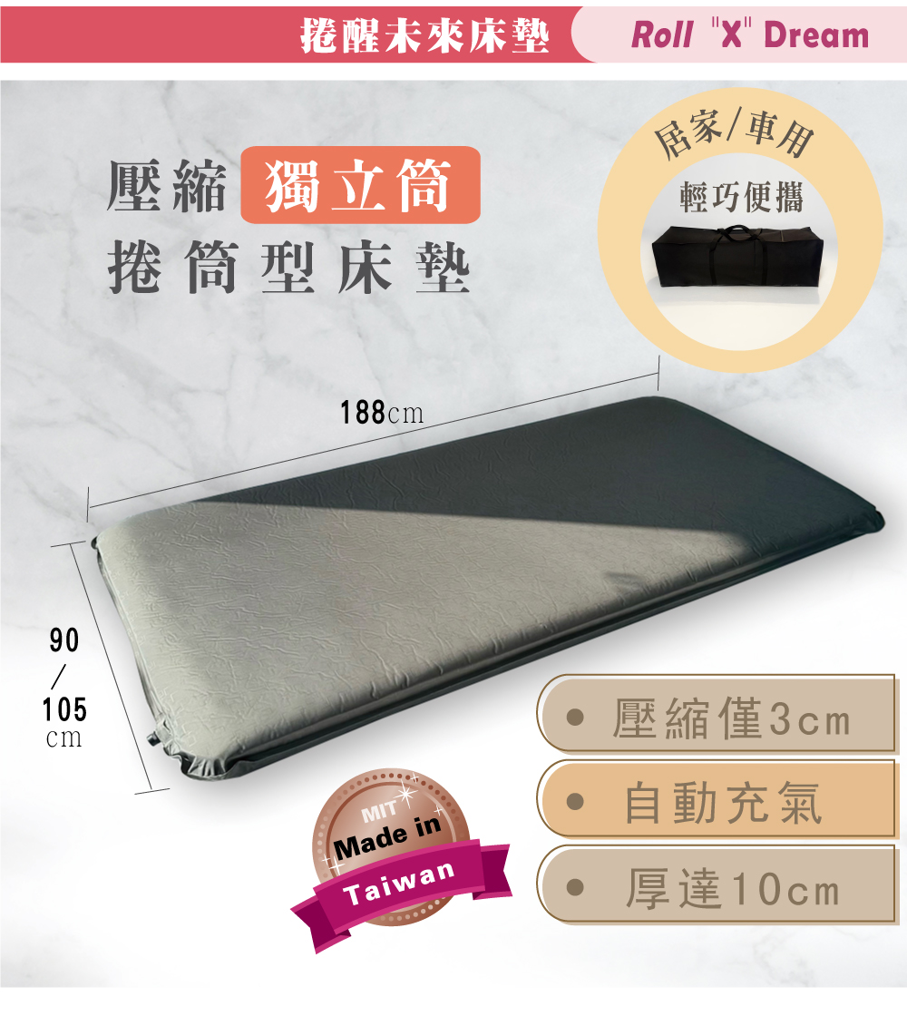 捲捲派:獨立筒隨行床-3尺-寬90x長188cm(附電動吸氣機與旅行帆布背包)