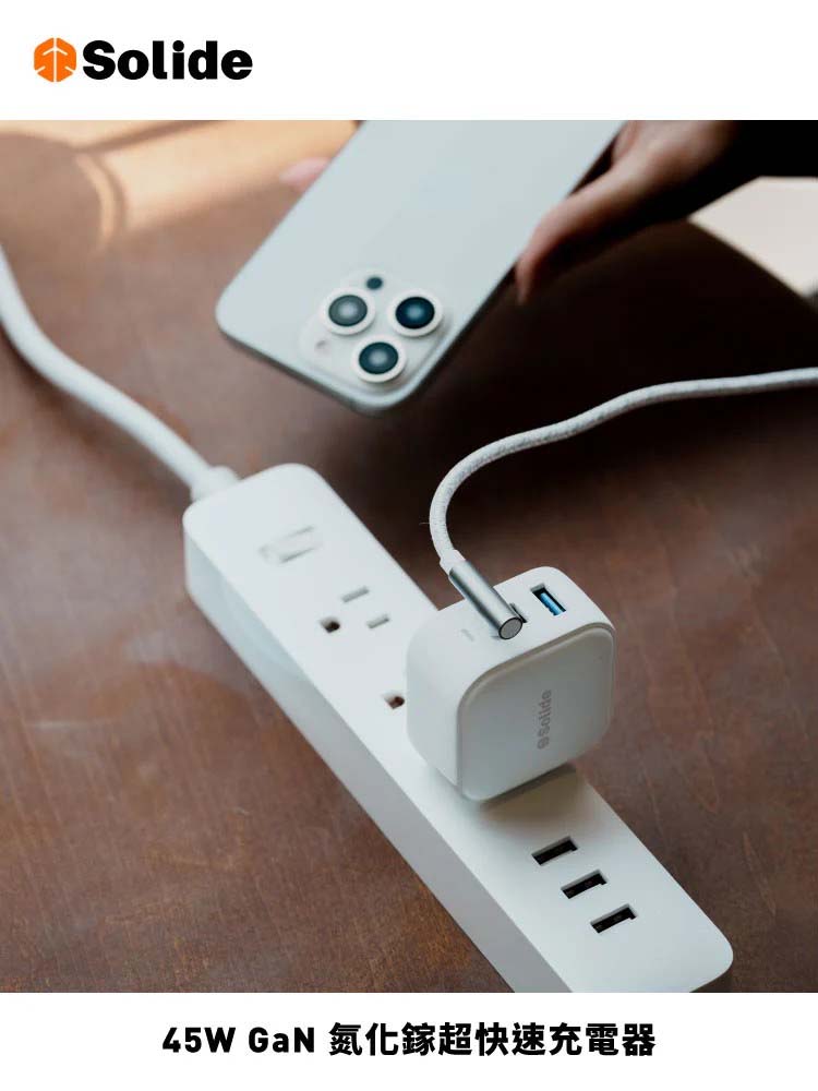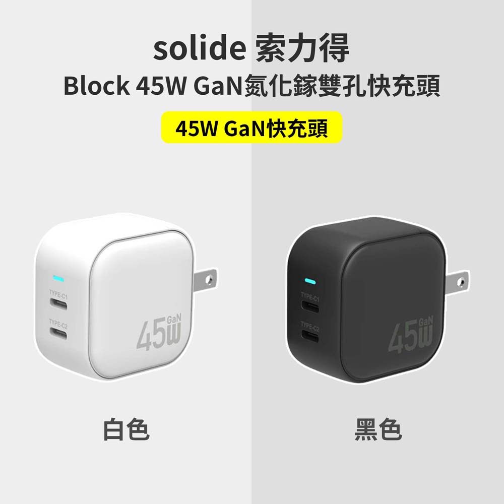 ・輕鬆摺疊充電插頭,移動便利【商品規格】Block 45W GaN氮化鎵雙孔快充頭– 品牌:solide– 型號:SOL-P4502– BSMI許可字號:R3D250– 材質:PC + ABS + 電子元件– 輸入:110-240V~50/60Hz 1.5A Max– TYPE-C1/TYPE-C2 輸出:MAX 45W (5V⎓3A,9V⎓3A,12V⎓3A,15V⎓3A,20V⎓2.25A)PPS : 3.3V-11V,4.05A– TYPE-C1+TYPE-C2 輸出:MAX 20W(5V⎓3A,9V⎓2.22A,12V⎓1.67A)+MAX 20W(5V⎓3A,9V-2.22A,12V⎓1.67A)– 總輸出:45W– 尺寸:48 x 48 x 30 mm– 重量:87 g ± 5 g– 工作溫度:0°C-35°C