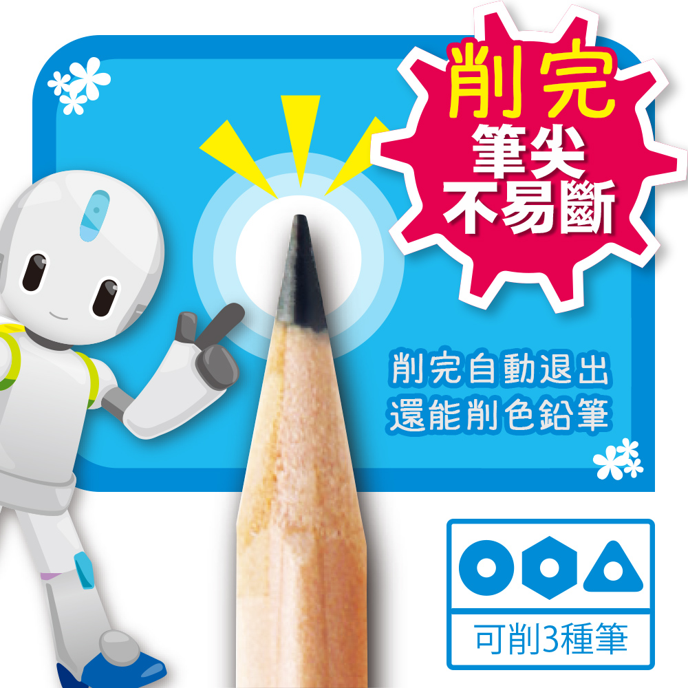粗大的鉛筆無法削哦~ ●日本專利,削尖會自動往後退回,不會過度削筆 ●尖度不會太尖,下筆不易斷 ●有防塵罩安全設計,碎片不會掉出 ●大容量木屑盒,有卡鎖裝置不怕孩童打翻 ●可對應圓型、六角形、三角形 一般鉛筆。色鉛筆也可以削 規格: 尺寸 : 84×121×141mm 材質:(本體)ABS(鉛筆屑桶)PS 產地:日本進口 / 中國製造