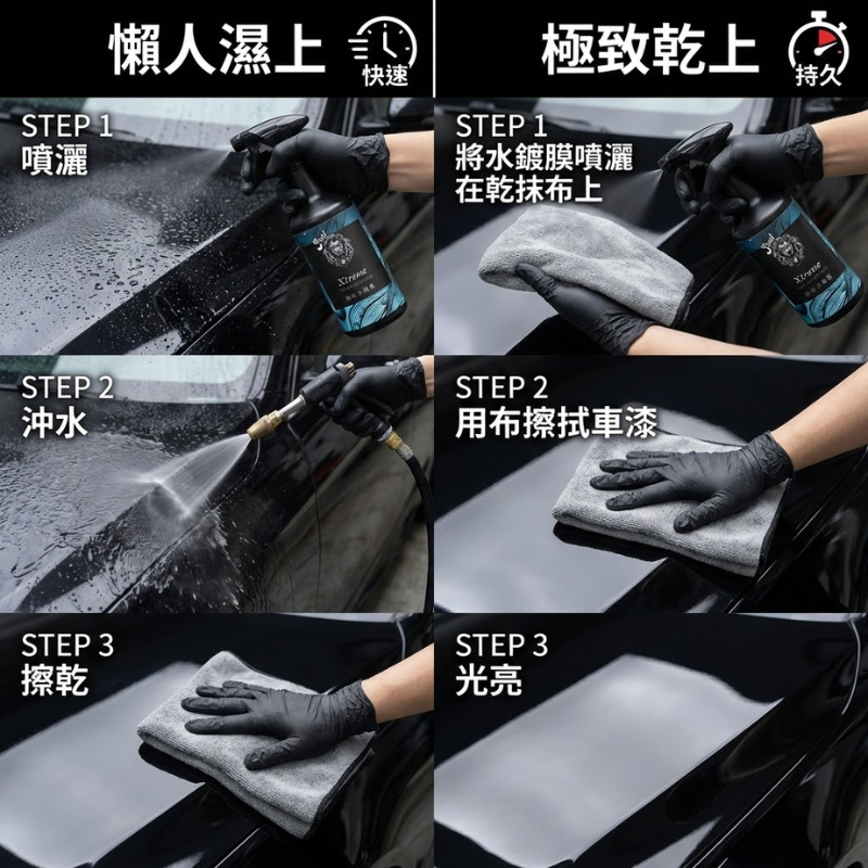 A2:「濕上」適合快速保養,洗完車沖水時同步噴灑並沖淨,省時省力;「乾上」適合追求極致效果,擦乾車身後分區噴灑擦拭,附著力與持久度會更好,但需注意避免藥劑乾燥。