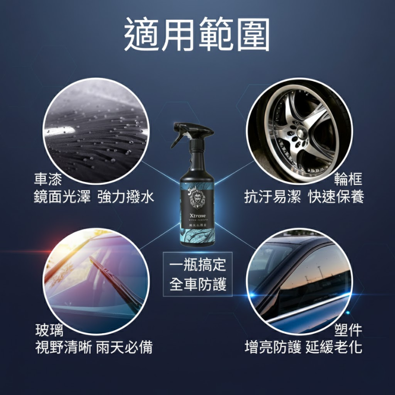 全車材質皆適用:一瓶搞定全車!除了車漆,亦可完美應用於前擋玻璃、後照鏡、輪框及外部塑膠件,不傷材質,省去購買多種藥劑的成本。