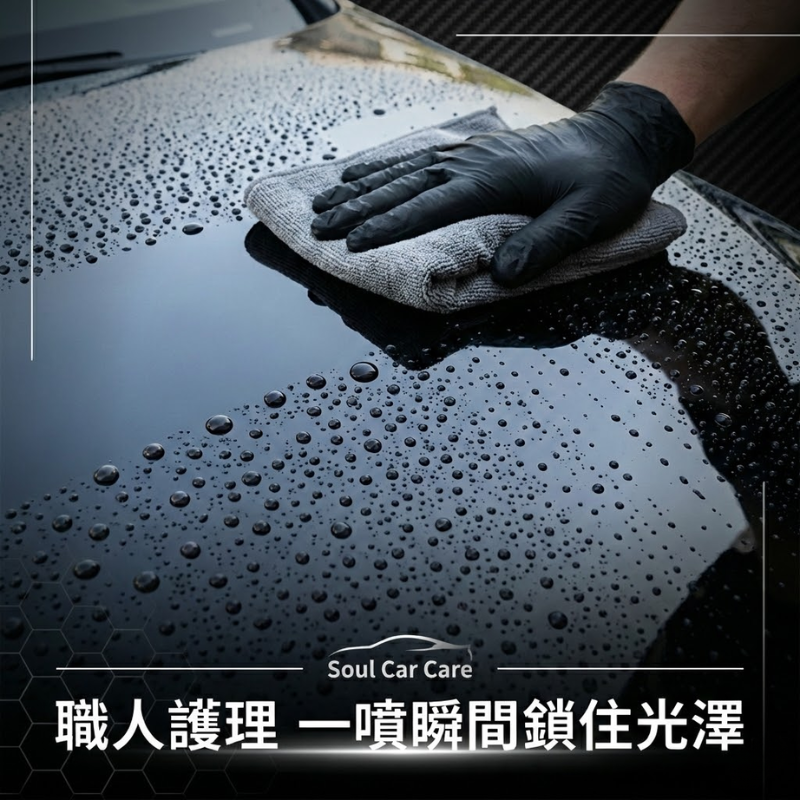 極致護理 (乾上):車身擦乾後,將藥劑噴於乾淨纖維布上,分區均勻擦拭至光亮,持久度與附著力更佳。