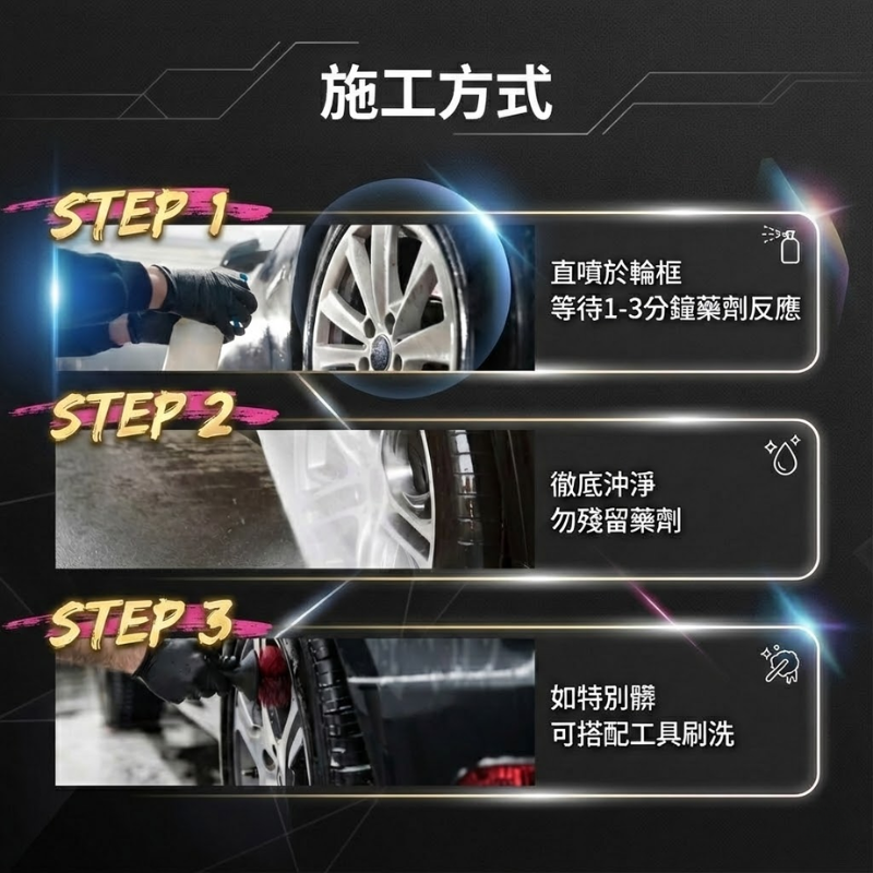 請勿在輪圈高溫或陽光直射下使用,以免洗劑乾燥過快留下水痕。
