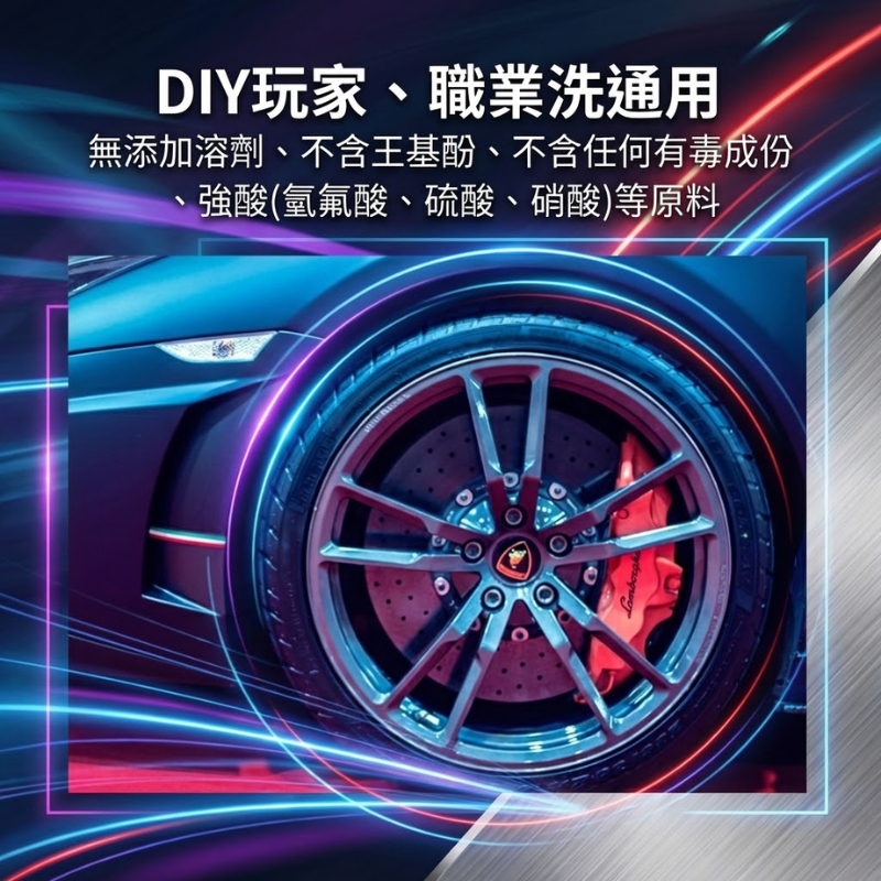 專為特殊材質設計:針對陽極、鍛造鋁圈、電鍍輪框等敏感材質開發,經測試將卡鉗浸泡長達 1 天仍不褪色、不氧化。