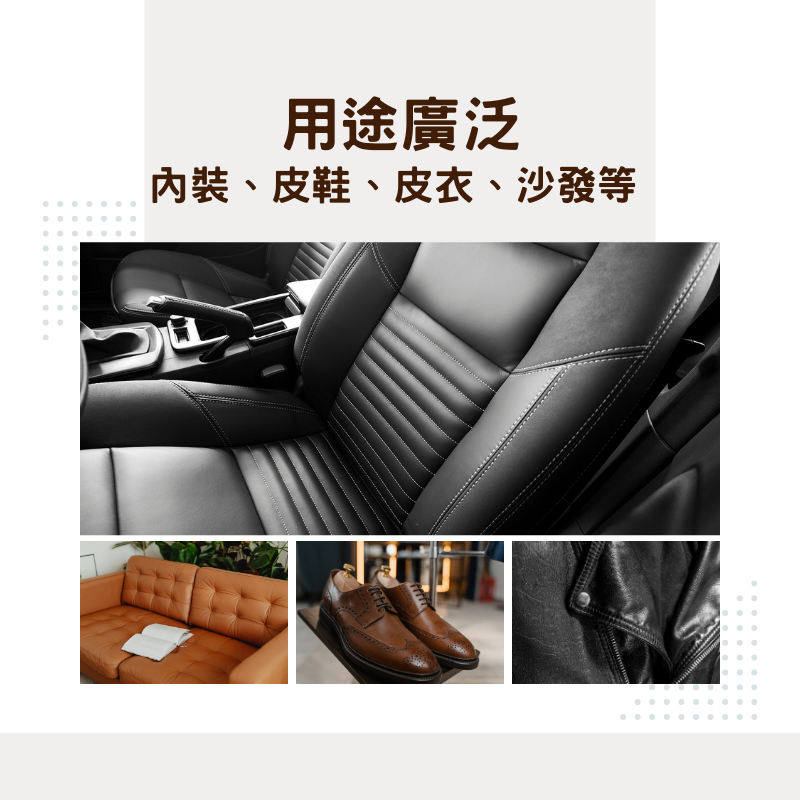 廣泛適用性: 不只汽車真皮座椅,半合成皮、合成皮、車內塑膠飾板/儀表板皆可使用。居家真皮沙發、皮衣皮件亦適用。