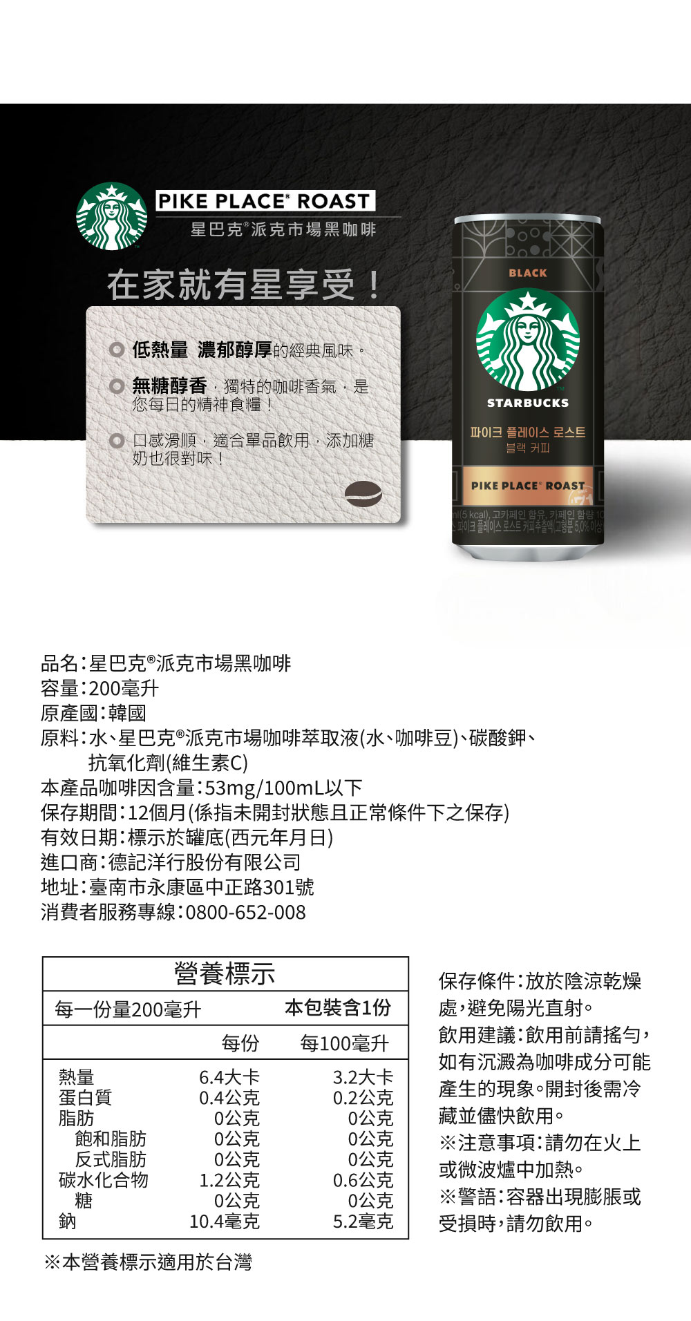 【德記洋行】STARBUCKS 星巴克 派克市場黑咖啡 200mlx24瓶