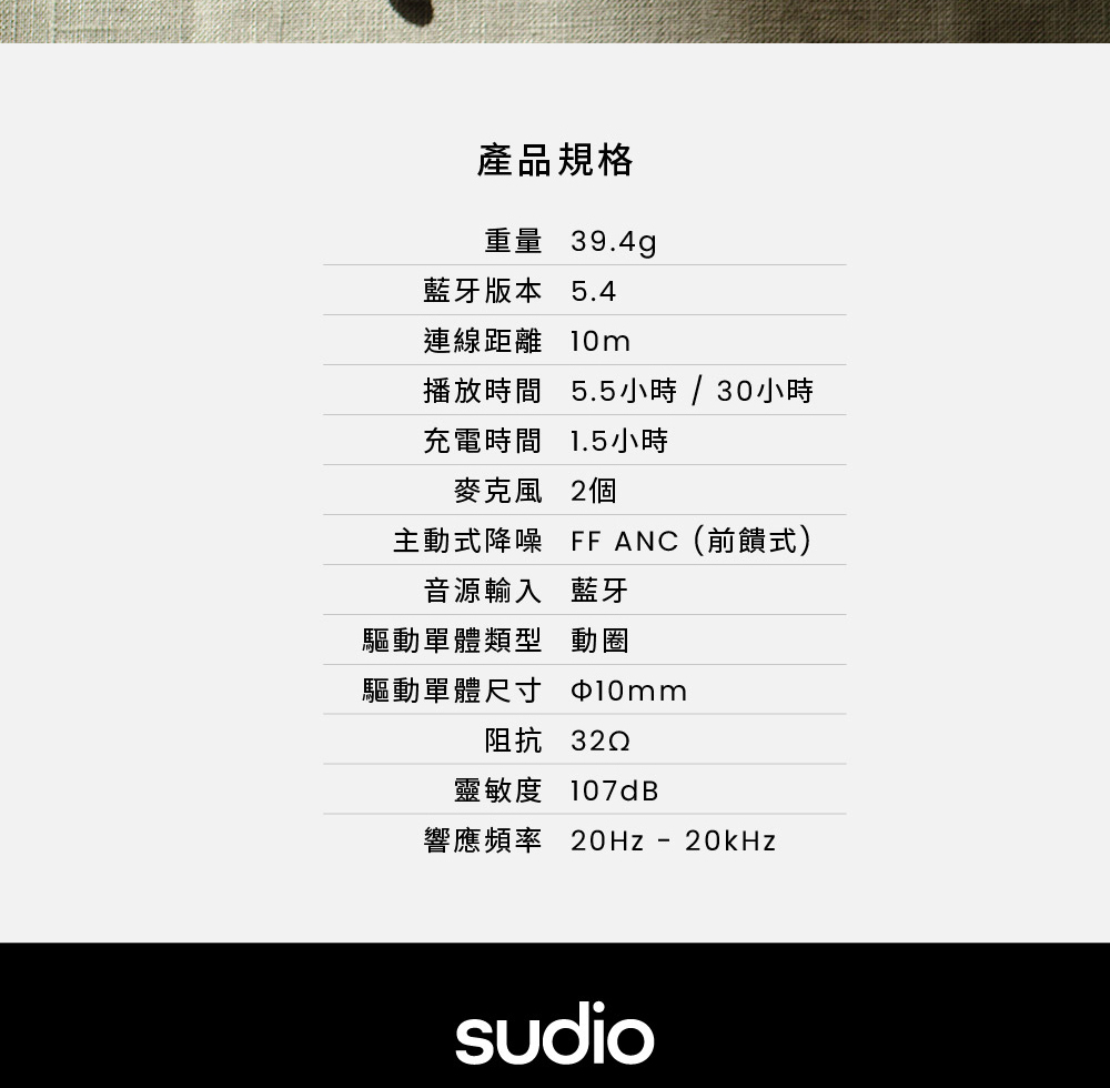 ■品牌︰瑞典■型號:SUDIO N3 Pro■保固:一年保固,到貨7日內線上登錄享共18個月保固■貨源:原廠公司貨■重量:39.4g■藍牙版本:藍牙5.4■連線距離︰10公尺■充電時間︰1.5小時■播放時間:5.5小時/30小時■麥克風︰2個■主動式降噪︰FF ANC(前饋式)■音源輸入︰藍牙■驅動單體型態:動圈■驅動單體尺寸︰10mm■阻抗:32 Ohm■靈敏度:107dB■響應頻率:20 Hz - 20 kHz■NCC認證碼:CCAF25LP153AT1■BSMI︰R38900~2028.08.13■包裝/內含配件︰N3 Pro真無線藍牙耳機、充電線、產品說明書*注意事項︰1. 此商品為影音相關之進口商品,拆封後無法以新品販售,故不做退換貨。開封後僅接受商品暇疪時之退貨或換發新品。2. 鑑賞期非試用期,若無商品暇疪要退換貨,退貨商品之包裝及內容物均須完整無破損無開封,方可申請退換貨,否則將酌收10%~30%整新費,回收之舊品將以打折之福利品再販售,不會再以新品重新販售,請客人多加注意及體諒!3. 建議客人在未確定品牌、款式型號、顏色、尺寸前,請先至實體店看實機並試聽,避免買賣雙方困擾。4. 產品顏色會因網頁呈現而有些許差異,以收到實品為準 。