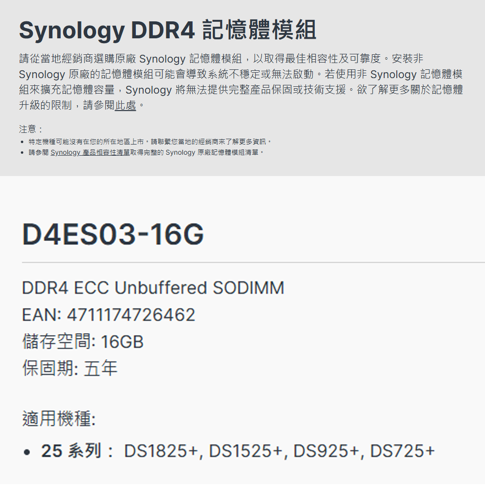 昌運監視器 Synology群暉 D4ES03-16G DDR4 記憶體模組