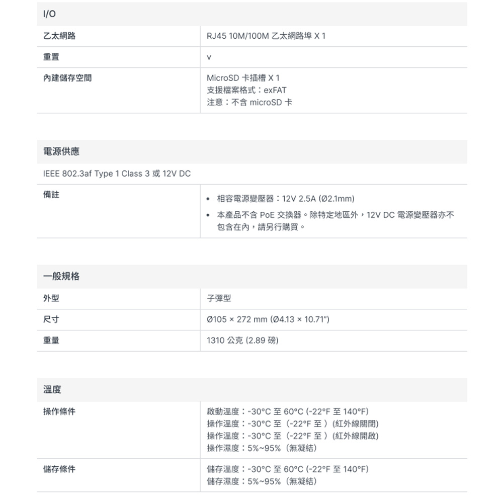 1/1.8 吋星光感光元件與混合白光/紅外線LED,最遠可達 31 公尺(101 英呎)彩色夜視