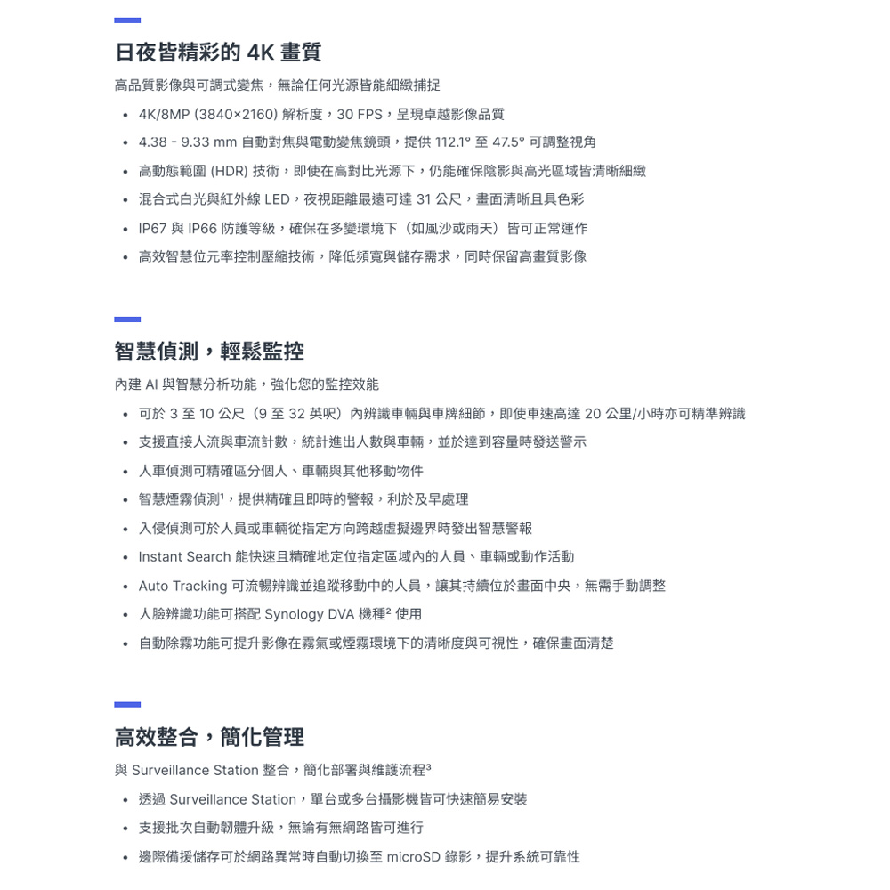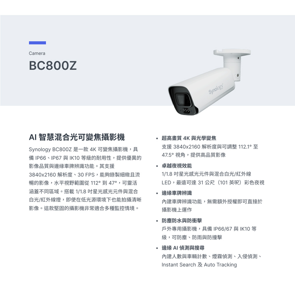 昌運監視器 Synology群暉 BC800Z 4K AI 智慧混合光可變焦攝影機