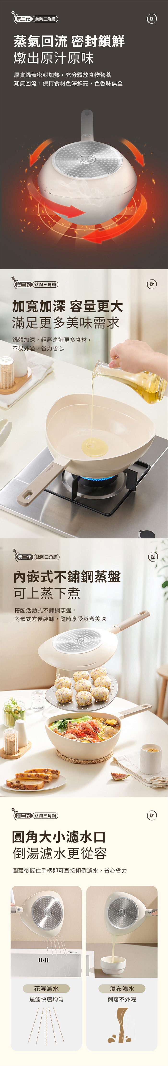 鍋具前緣兩側濾水口設計,斷湯俐落不外灑