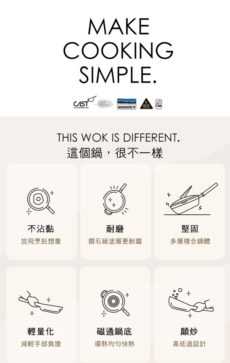 ●高低邊非均衡設計與傳統鍋的等高邊不同,採非均衡設計,拋甩食材時順著鍋型,離心力將食材甩回鍋裡,廚房菜鳥也能輕鬆掂炒。