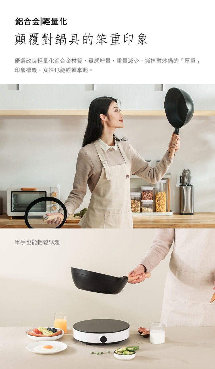 奶鍋規格:尺寸:鍋內直徑18cm,含蓋總高17cm,總長35cm,鍋底厚度3.6mm(手量誤差±3%)材質:鋁合金,德國櫸木表面處理:瑞士ILAG輕質強化不沾層容量:2.4L重量:932g(含蓋)適用工具:尼龍鏟/勺、木鏟/勺、矽膠鏟/勺產地:中國