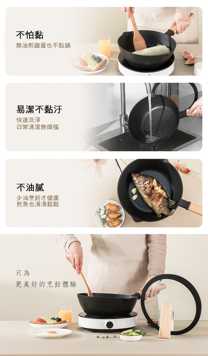 ※第一次使用時,請在鍋內裝滿1/2水煮沸,倒掉,再用餐巾紙蘸取食用油擦拭一遍即可。※嚴禁長時間空鍋乾燒,以免影響鍋具的不沾效果和使用壽命。※感應膠圈為手把所反饋的溫度做為防燙手提示,不等於鍋底溫度,請勿空燒或大火。※切勿使用金屬鏟,請使用不沾鋼專用的矽膠鏟,木鏟,尼龍鏟等。※使用後及時清洗鍋具,並將鍋具擦乾,保持鍋具清潔。切勿使用鋼絲球,用清潔布,海綿刷即可!※如溫度過高或鍋體外壁沾有油漬等雜質,加熱可能變色,請及時清洗。※不建議經常烹飪貝殼類食物/帶骨頭的食物(長期烹飪堅硬食物會劃傷鍋子影響不沾效果和使用壽命)※嚴禁手柄與鍋蓋把手長時間浸水,防止變形,影響使用壽命!※注意若發現手柄鬆動請及時栓緊,保護木柄不裂開。※避免超高溫(260℃含以上),會損傷不沾層。※請選用合適的食用油烹任,冷鍋入油,油熱入菜。大多數食物油沸點最高在200℃左右, 而菜籽油或花生油淋點在330℃左右,沸點偏高,較適合用鐵鋼等鋼具烹飪。※考慮到國內電磁爐溫控表現參差不齊,在使用電磁爐時,請盡量將功率控制在1600W(210度)以內。※商品圖檔顏色因電腦螢幕設定差異會略有不同,以實際商品顏色為準,敬請見諒。※精美包裝若退貨損毀包裝將收取售價之50%做為整新費,請尊重品質與包裝。※此商品不提供測試試用不開放體驗。若不能接受請勿購買。