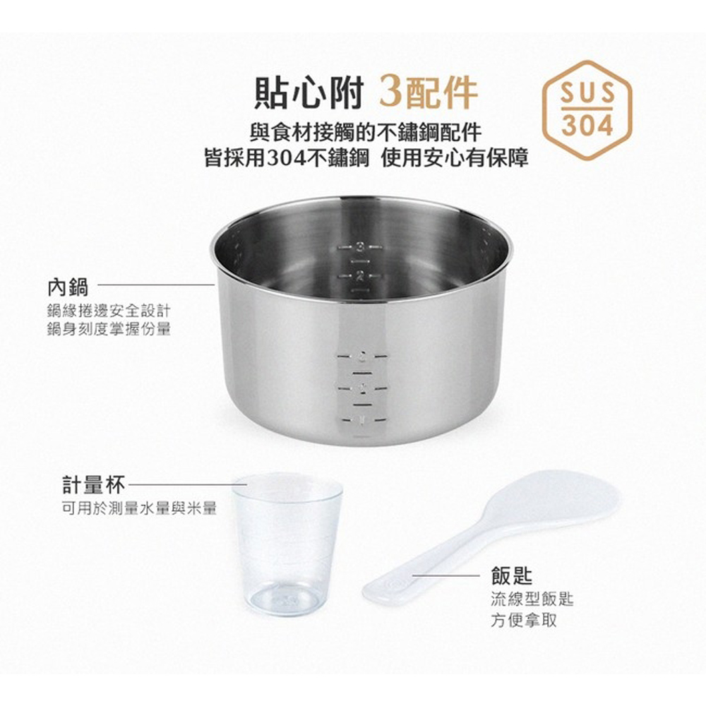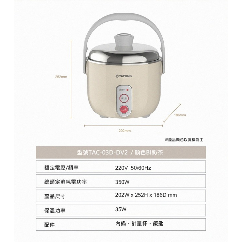 ◆消費權益◆■ 鑑賞期並非"試用期"。■ 退貨商品需是「全新商品」且「包裝完整」,包括外箱、包材、贈品等原廠所有配件,缺件、刮傷皆不同意退換貨。■ 大型家電一經拆箱定位安裝、插電及使用後,除原廠鑑定為商品問題外,不得以其他個人理由退換貨。■ 商品簽收前請務必確認商品型號、顏色正確,一經簽收即代表同意,不得以其他個人理由退換貨。■ 對商品有疑慮的地方請務必先詢問,能接受再訂購!■ 商品送達後若因買家因素無法安裝或拒收,買家需負擔賣家出貨產生的物流費用商品特色:220V異電壓(僅國外適用)3人份電鍋,奶茶色外殼內外鍋均為SUS 304 不鏽鋼加熱均勻,自動保溫雙重被覆電源線,雙重安全保護煮飯/粥、蒸、滷、燉多用途外型小巧方便商品規格:型號:TAC-03D-DV2顏色:奶茶色噴塗外殼(BI)規格:3人份電壓:220V 50/60Hz消耗功率:350W/保溫:35W產品尺寸(高寬深):25.2 x 20.2 x 18.6 cm重量:2.6kg能效分級:4主體:電鍋、內鍋、鍋蓋配件:量米杯、飯匙產地:台灣BSMI:R31001貨源:公司貨※此機型有保溫開關※異電壓電鍋“僅符合當地電壓使用,請自行另購買當地的轉換插頭使用”※異電壓商品保固、維修、退貨相關辦法僅限於台灣本島不適用國外※本商品資訊由網路及官網收集彙整而成,僅供參考,如有更新或異動不另外通知,正確商品資訊及規格以實機為準。鑑賞期非試用期,產品一經拆箱、插電及使用皆會影響您退貨權利並酌收整新費用。