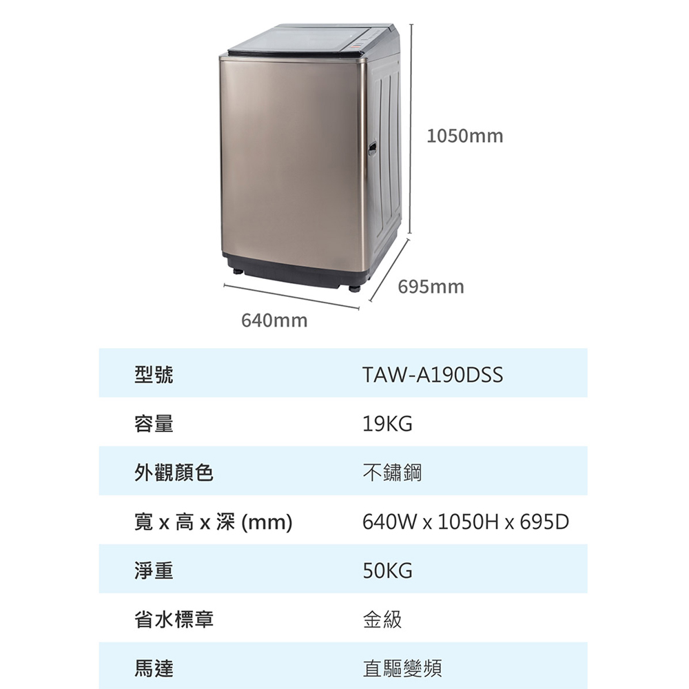 ■ 商品送達後若因買家因素無法安裝或拒收,買家需負擔賣家出貨產生的物流費用商品特色:台灣製造DD直驅變頻安全緩降上蓋設計Smart Fuzzy智慧控制多重感應裝置判斷適合的水量和時間槽洗淨功能可防霉除菌多種行程可選擇設定氣泡洗淨去污效果超極好立體水流衣物深層洗淨不鏽鋼立體內槽增加搓揉面積隱藏式棉屑濾網搜集清理更方便商品規格:型號:TAW-A190DSS顏色:金色系電壓:110V / 60Hz尺寸:640W x 1050H x 695D mm重量:50 kg內槽材質:不鏽鋼+塑料洗衣行程選擇:6種洗衣容量:19 kg洗衣槽類型:單槽馬達型式:變頻馬達保固:1年產地:台灣BSMI:R41002貨源:公司貨本商品資訊由網路及官網收集彙整而成,僅供參考,如有更新或異動不另外通知,正確商品資訊及規格以實機為準。鑑賞期非試用期,產品一經拆箱、插電及使用皆會影響您退貨權利。廢四機回收資訊:如需回收廢四機請於下單時備註,如未於訂單備註,後續需另派工收回將酌收派工費用500~1200元(跨區費另計)新購公告指定規格之電視機、洗衣機、電冰箱或冷、暖氣機時,販賣業者應提供同項目、數量、時間及同送達地址之廢四機回收(搬、載運)無償服務。但不包含為搬運、拆卸而動用大型機具、工程或危險施工等。消費者本人簽名確認已被口頭告知或知悉上述權益。本站配合環保署廢四機回收服務,本公司廢四機回收專線:0800-550678,環保署資源回收專線0800-085717。