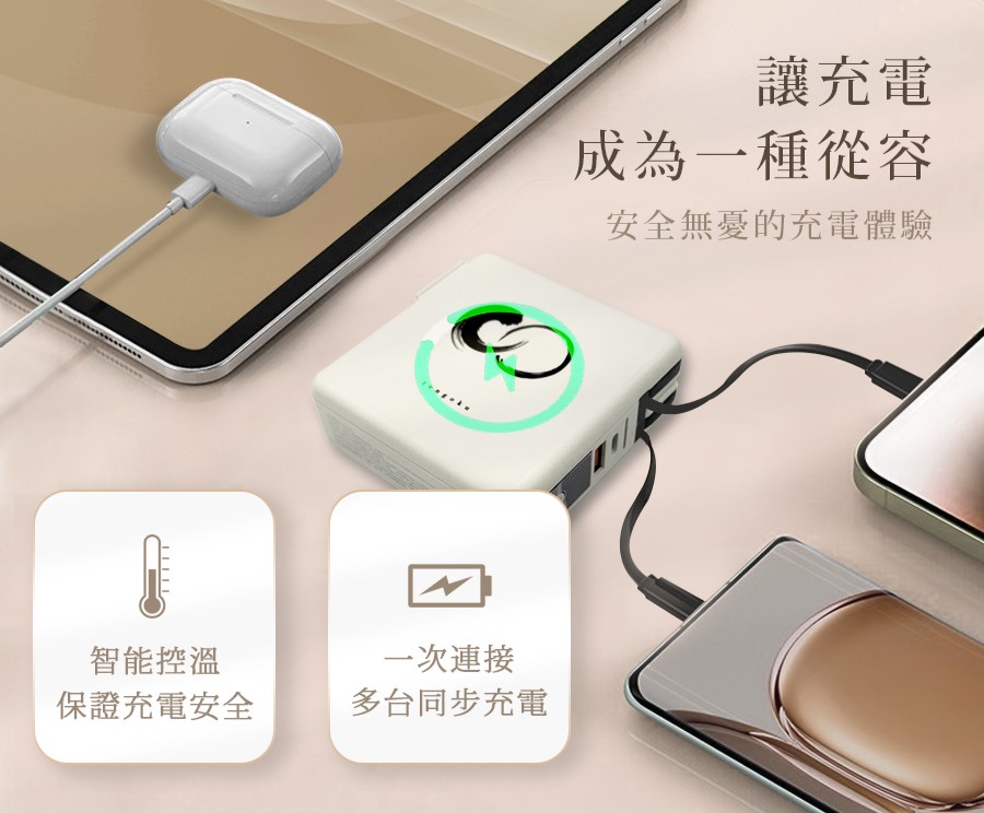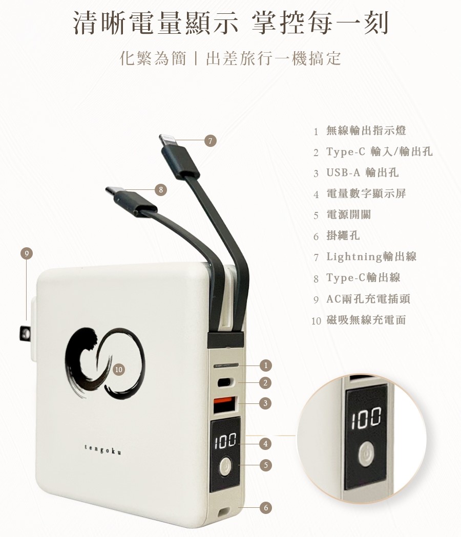 內建雙線:自帶Type-C與Lightning線,免額外攜帶。