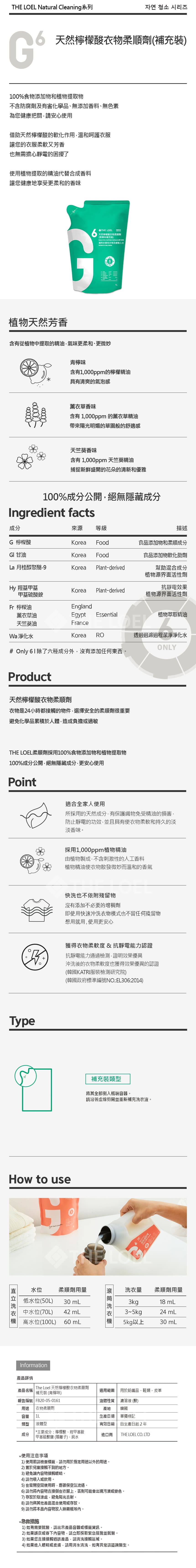 -Natural Cleaning系列-100%天然植物&食品添加物配方-含非基因改造優質檸檬酸,軟化呵護衣物-植物提取物代替合成香料,享受健康的柔和香味-保護織物天然成分配分-獲優異衣物柔軟度認證(韓國KATRI)-獲優異抗靜力效能認證(韓國KATRI)-快洗也不依附殘留物配方-不含磷、氯、螢光劑、香料、色素,不刺激皮膚-不含鄰苯二甲酸、磷酸鹽等有害物質-100%成分公開,絕無隱藏成分-適用於清洗全家人衣物-手洗 / 機洗均適用-韓國製造