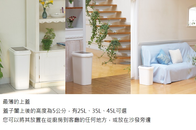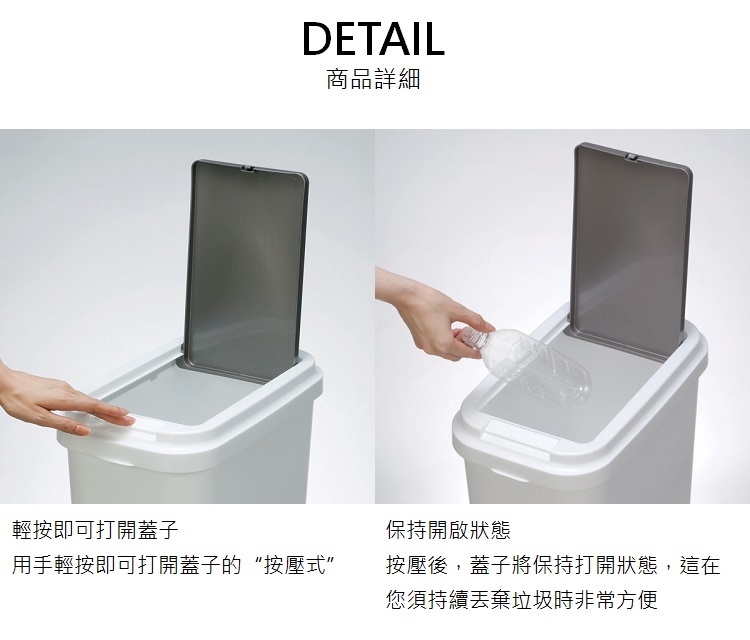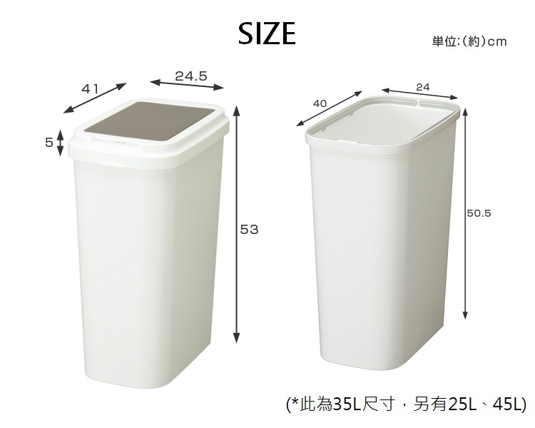 白色的外觀加上輕按即可打開蓋子 是一個非常方便又實用的垃圾收納桶內有垃圾袋設置環可固定垃圾袋尺寸:約 寬41x深24.5x高53cm材質:聚丙烯容量:約 35公升重量:約 1.14公斤生產國:日本
