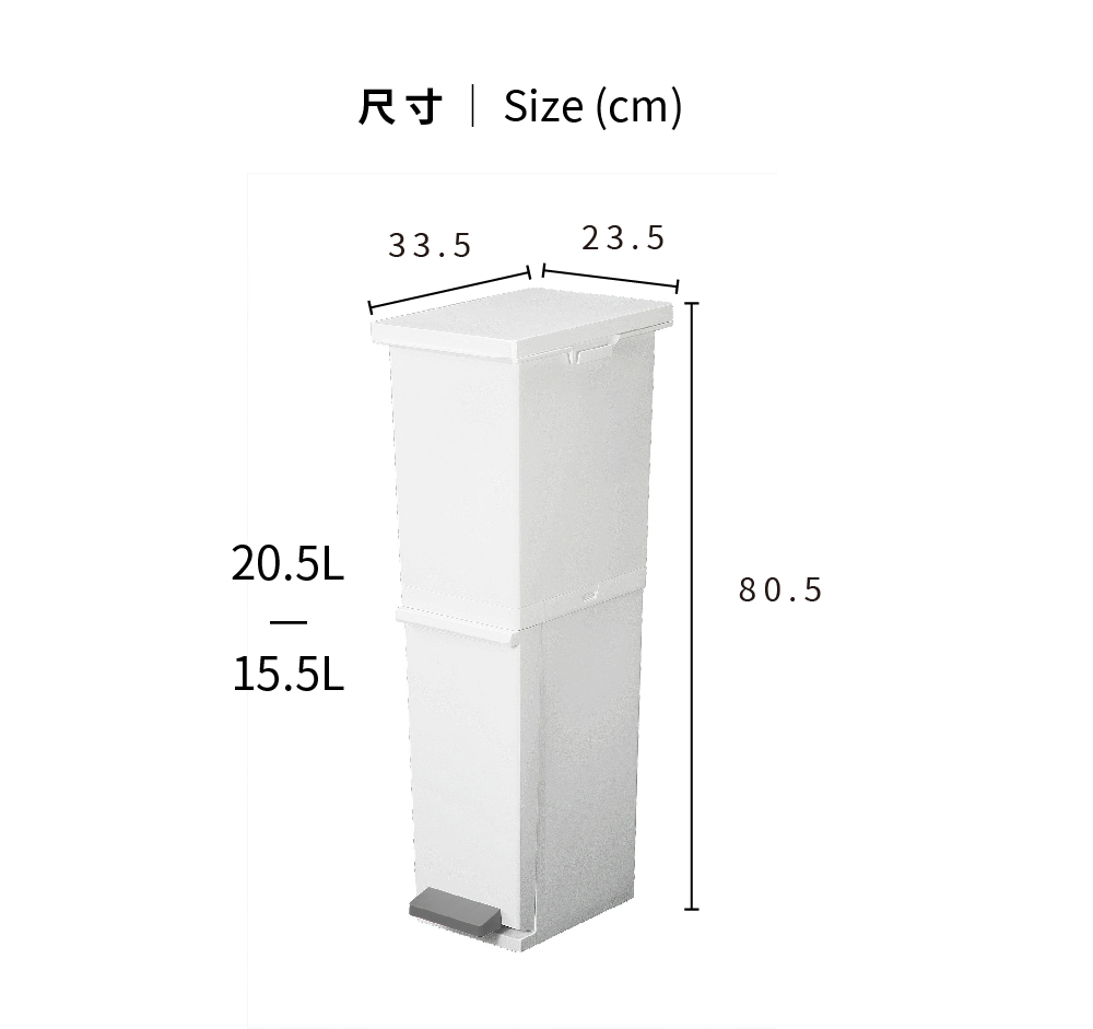 尺寸:33.5×23.5×高度80.5 cm材質:PP容量:36L(上段約20.5公升+下段約15.5公升)重量:2.6Kg耐重:約20kg(較重的物品建議放下層)原產地:日本