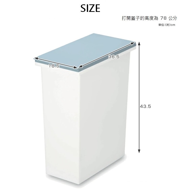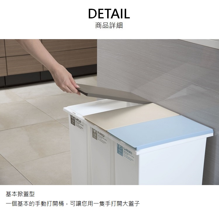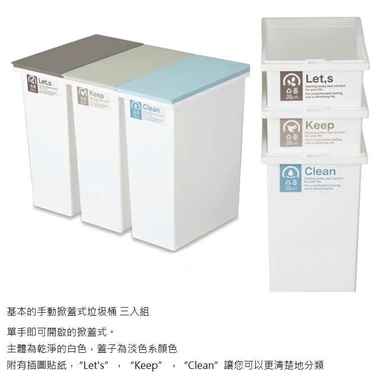 基本的手掀上蓋式垃圾桶 以簡單自然的顏色 呈現不一樣的美感 三入組 三種顏色一次滿足纖細的容量,在狹窄的地方也能輕鬆置入可依環境擺放在一起或是分開使用都方便*此商品為三入組(三種不同顏色)*尺寸:約 寬18.5x深36.5x高43.5cm(單個)(打開蓋子後高度為78公分)材質:聚丙烯容量:約 20公升(單個)重量:約 0.9公斤(單個)生產國:日本