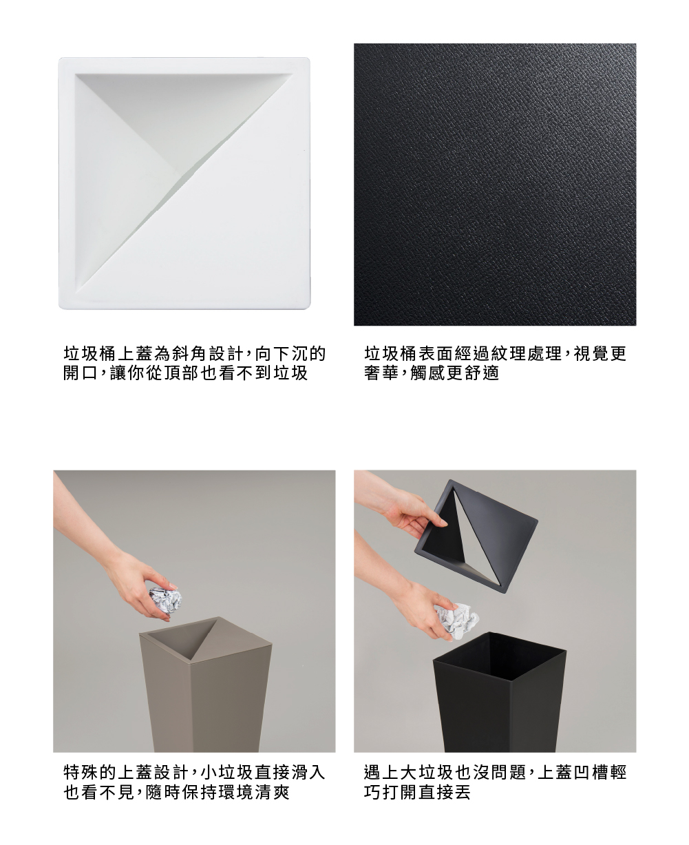 半開口設計,擁有高方便性及隱密性上蓋為斜角設計,讓您從頂部也看不到垃圾將輕巧的上蓋打開後,亦可丟棄較大型垃圾尺寸:17×17×高度28 cm材質:PP容量:5.5L重量:0.375Kg原產地:日本
