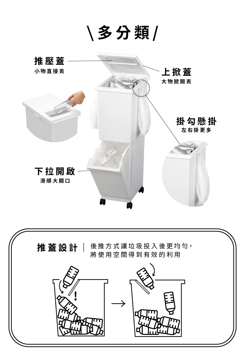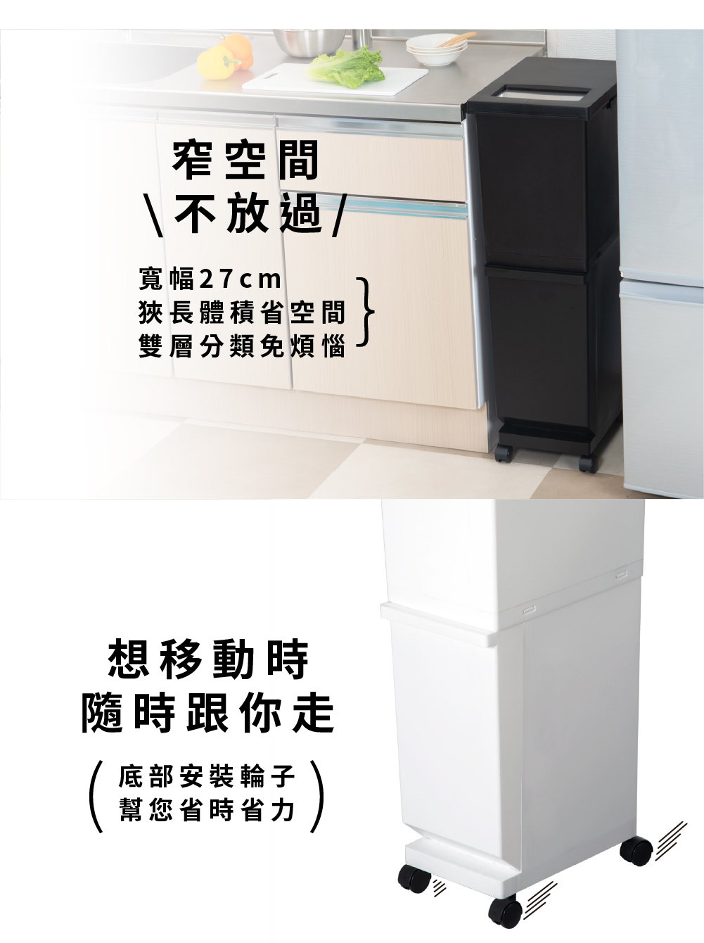 寬度僅有27公分,因此放置在櫃與櫃之間是一個聰明的選擇除了雙層空間方便您收納(分類)不一樣的物品在左右兩側還有掛勾可以吊掛收納喔,一秒變成4種分類且附有輪子讓您可以方便任意移動尺寸:41×27×高度87 cm扣掉輪子後的尺寸:41×27×高度82.2 cm材質:本體-PP、輪子-PP、PC、鋼容量:55L(上段約32公升+下段約23公升)重量:3.26Kg耐重:約20kg(較重的物品建議放下層)原產地:日本