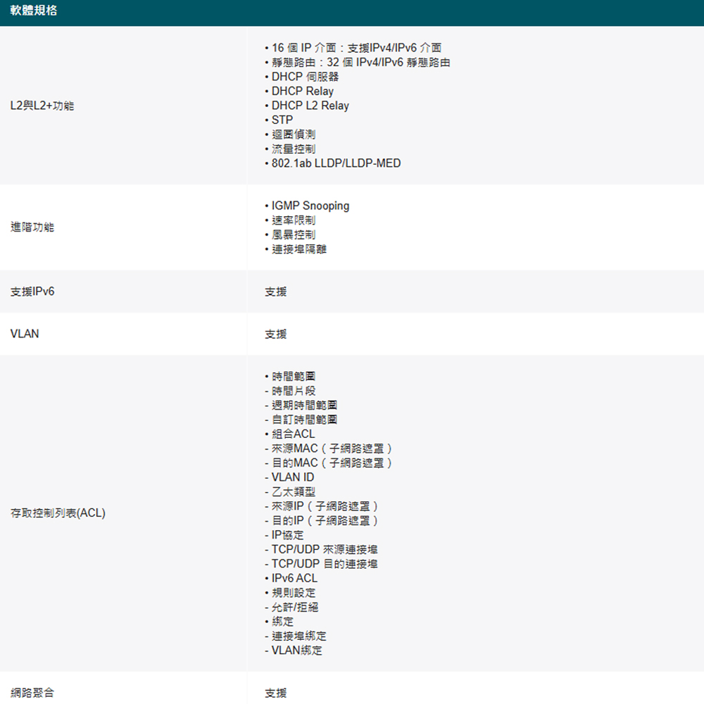 8× Gigabit 802.3af/at PoE+ 連接埠 和 2× Gigabit SFP 插槽 61 W 總 PoE 供電,每個連接埠高達 30 W PoE 輸出* 以消費者為導向的簡約設計同時具備完整商用等級的Festa生態系統 透過 Festa App 或網頁提供免費的雲端集中管理† 簡易設定與使用 零接觸設定 (ZTP) 與 自動組織網路 (SON) 靜態路由、VLAN、ACL 與 IGMP Snooping 無風扇設計,靜音運行 精美的金屬外殼,桌上型/壁掛式設計