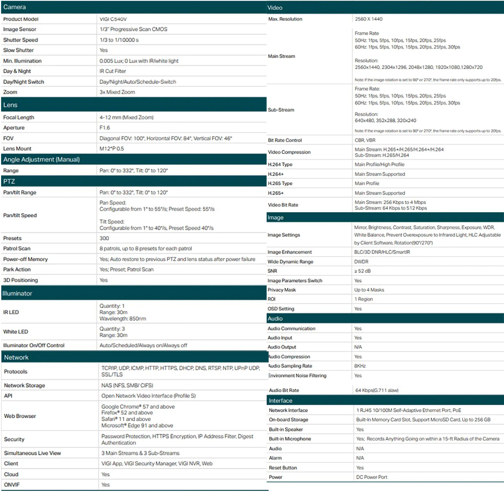 【此組合為 VIGI NVR1008H-8MP 8路PoE+ 網路監控主機/監視器主機(NVR)+VIGI C540V 4MP 戶外全彩 Wi-Fi 變焦旋轉式監視器6支】 主機 4K HDMI 影像輸出 & 16MP 解碼能力: 提供高達 8MP 的更清晰影像解析度以及 8 路畫面顯示,確保您可以從任何角度捕捉所有細節‡。 透過 PoE+ 讓安裝更簡單: 透過一條 RJ45 網路線連接您的 PoE 攝影機,便能同時傳輸電源和資料,讓攝影機無須另外連接變壓器。 8 路同時回放*: 同時最多可回放 8 台攝影機、增加回放速度並在排程中輕鬆查看影像紀錄。 H.265+: 攝影機可以傳輸壓縮過的超清晰影像,不佔用額外頻寬並節省硬碟空間,減輕網路負載,在減少監控成本的同時不犧牲影響品質。 支援 ONVIF△: 從 VIGI 輕鬆新增所有支援 ONVIF 協定的攝影機,建立強大且多樣的網路影像。 隨插即用: 允許新拆封尚未使用的 VIGI 攝影機自動新增至 NVR,讓您接線即使用,體驗前所未有的快速安裝。 24/7 全天持續錄製: 儲存所有連線的攝影機影像,可另接高達 16 TB 的硬碟,並提供更快、更方便的存取。 遠端監控: 獨家 VIGI app、網頁介面和 VIGI Security Manager 讓便利的遠端監控不是夢,無論何時何地都能觀看即時影像和回放。 雙向語音: 支援對講功能,無論在哪,當您觀看即時影像時都能進行雙向溝通。 安裝彈性: 將 NVR 安裝在機架上或放在桌上,選擇適合您的安裝方式。 攝影機 4MP 高解析度:高達 4MP 的影像,更高的畫質提供更細緻的影像。 24H 全彩畫面:借助大光圈鏡頭、高靈敏感測器和 4 倍補光燈,即使在漆黑的條件下也能捕捉 24 小時的全彩細緻影像。 3 倍變焦:允許更近距離檢視廣闊區域的物體。 即時變焦:即時的縮放功能,,不受延遲和圖像拖曳的影響。 人&車分類:可區別人及車輛物體,因此接收到的事件通知將更精確。 智慧偵測:當有人越過邊界、遮擋鏡頭、進入/離開特定區域、或在指定區域移除或遺留物件時,可接收通知並查看動態。 強大的旋轉鏡頭:自定義巡邏路線及自動追蹤,提供更智慧的功能以監控關鍵區域,以提高您財產的安全性。 主動防禦:當異常事件發生時,立即用聲光警告潛在的入侵者。 雙向語音:支援對講功能,無論在哪,當您觀看即時影像時都能進行雙向溝通。 H.265+:以不犧牲品質的方式壓縮影像,不佔用額外頻寬並節省硬碟空間。 IP66 防塵防水:可靠的 IP66 提供穩定的戶外效能。 彈性的管理及儲存:透過四種方式完全管理您的環境安全:網頁、NVR 管理介面、VIGI app、VIGI Security Manager 軟體管理程式。支援本地儲存,並帶有 SD 卡插槽(最大支援 512GB)。