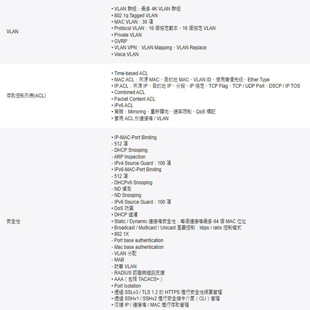 全 10G 提供閃電般的連線速度: 透過 4× 10 Gbps RJ45 連接埠和 2× 10 Gbps SFP+ 插槽,提供超快高頻寬連線能力。PoE++ 輸出提供 200 W 總供電†: 四個 802.3af/at/bt PoE++ 10G 連接埠提供每個埠高達 60 W PoE 輸出,是佈署 Omada WiFi 6 和 WiFi 6E AP 的理想選擇。‡ 豐富的 L2 和 L2+ 功能: 支援完整的 L2 和 L2+ 功能,包含靜態路由、企業等級的 QoS 和 IGMP Snooping。靜態路由: 幫助路由內部流量,更有效的使用網路資源。集中雲端管理: 整合至 Omada SDN 提供雲端存取和遠端管理。獨立管理: 網頁、CLI (Console Port、Telnet、SSH)、SNMP、RMON 和 Dual Image 提供強大的管理能力。https://s-cf-tw.shopeesz.com/file/tw-11134202-7rasc-m4e3poeeg6jh53https://s-cf-tw.shopeesz.com/file/tw-11134202-7rasg-m4e3poks6ucd98https://s-cf-tw.shopeesz.com/file/tw-11134202-7rasc-m4e3pos9vvod19https://s-cf-tw.shopeesz.com/file/tw-11134202-7rasi-m4e3pozhlbml4d
