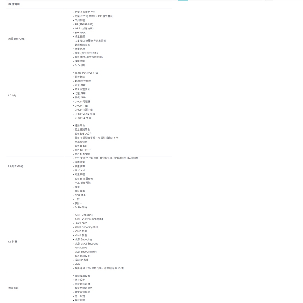 -如閃電般快速的 10G 連線: 4× 10 Gbps SFP+ 插槽提供高頻寬連線和無阻塞的交換容量。 -384W PoE 供電: 24 個相容於 802.3at/af 的 PoE+ 連接埠,總供電為 384W。-整合至 Omada SDN: 零接觸管理 (ZTP)*、雲端集中管理和智慧監控。-集中管理: 雲端存取和Omada app 提供便利且簡易的管理方式-靜態路由: 幫助路由內部流量,更有效率的使用網路資源。-強大的安全策略: 提供IP-MAC-Port綁定、ACL、Port Security、DoS防禦、風暴控制、DHCP Snooping、802.1X, Radius驗證等..進階安全管理功能。-優化聲音和影片應用: L2/L3/L4 QoS和IGMP snooping。-獨立管理模式: 網頁、CLI (Console Port、Telnet、SSH)、NMP、RMON、和雙映像帶來強大的管理能力。